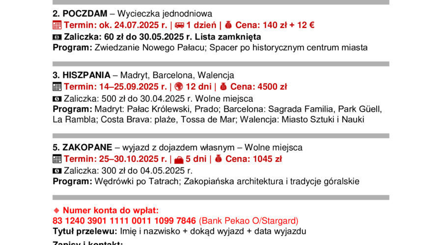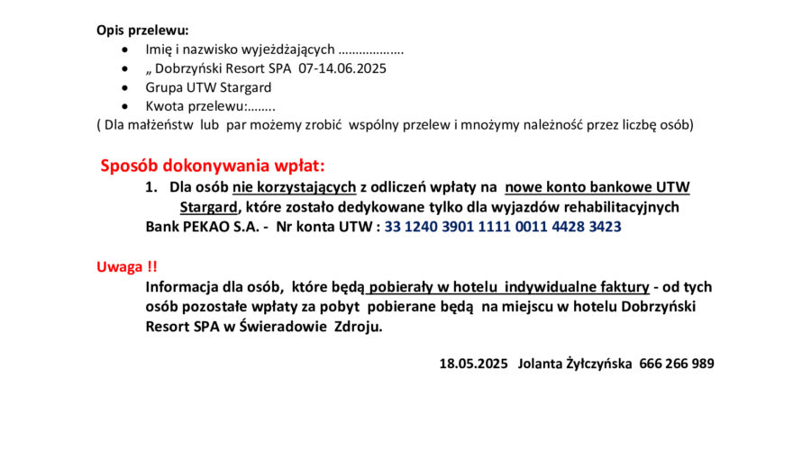 Transport wyjeżdża z Zintegrowanego Centrum Przesiadkowego (dwa autobusy przegubowe – około 80 osób w jednym autobusie) o godzinie 11:15. Będą wyjeżdżać jeden po drugim o tej godzinie (nie mogą tam długo stać – na tablicach wyświetlony napis „MPK- MPK”). Po zakończonej zabawie wyjeżdżamy w drogę powrotną o godz. 16:45 z lotniska i wysiadamy na ZCP (nie ma przystanków po drodze). Wstawiła: Halina Gębka