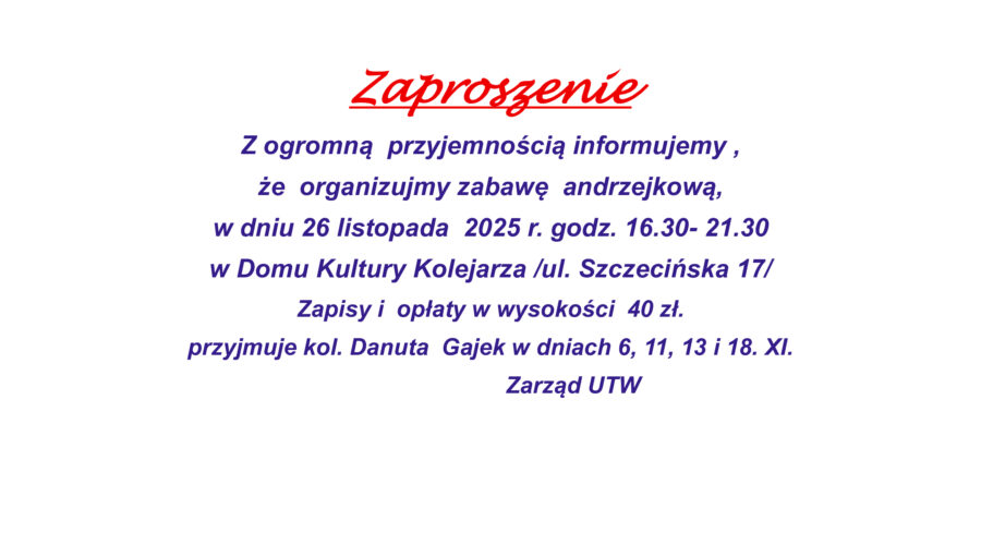 14.11.2025 godz. 17:30 – Książnica Stargardzka ul. Mieszka I – Festiwal Literacki, Spotkanie Autorskie z Ingą Iwasiów – Temat: O Słodko-Przemocowym Dragu 21.11.2025 godz. 13:00 – Książnica Stargardzka ul. Mieszka I – Danusia Gajek oraz Rysia Szofińska – Temat: Rękodzieło Artystyczne 28.11.2025 godz. 13:00 – Książnica Stargardzka ul. Mieszka I – Marian Wolanin – Temat: Piwnica pod Baranami w Krakowie – artyści. Pozdrawiam, Teresa Śmiguła