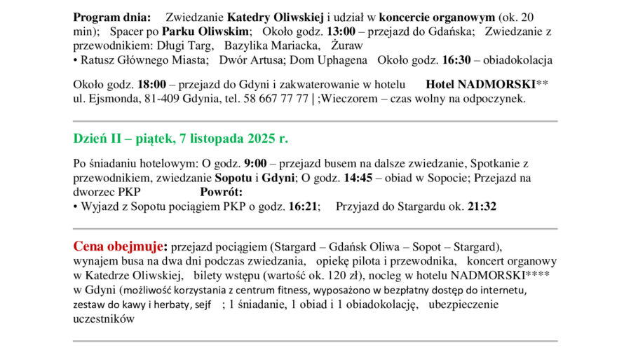 Wycieczka do Trójmiasta Gdańsk – Gdynia – Sopot – Oliwa Termin: 6–7 listopada 2025 r. Koszt uczestnictwa: 680 zł