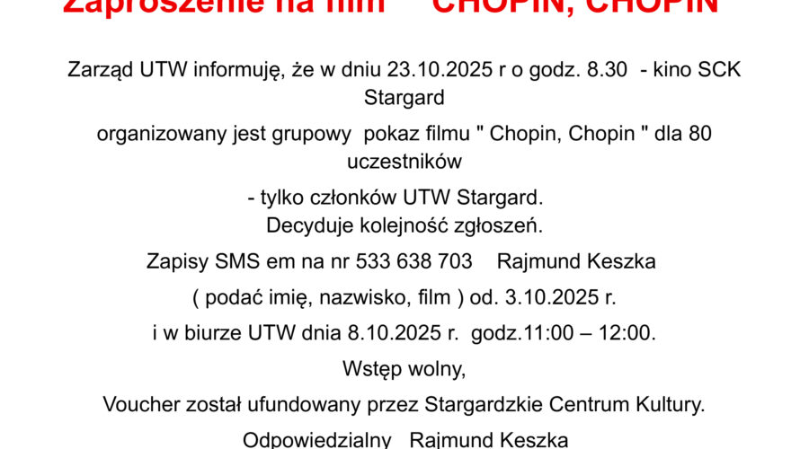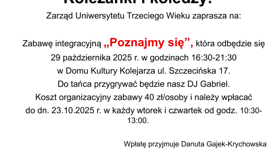 Sekcja Literatury, Sztuki i Historii serdecznie zaprasza na spotkanie,które odbędzie się 24 października 2025 r. o godz. 13:00. Podczas spotkania koleżanka Wiesława Gutowska zaprezentuje swoje pasje – muzykę, taniec i śpiew. Jednocześnie informujemy, że spotkanie Sekcji zaplanowane na 31 października 2025 r. nie odbędzie się. Teresa Śmiguła