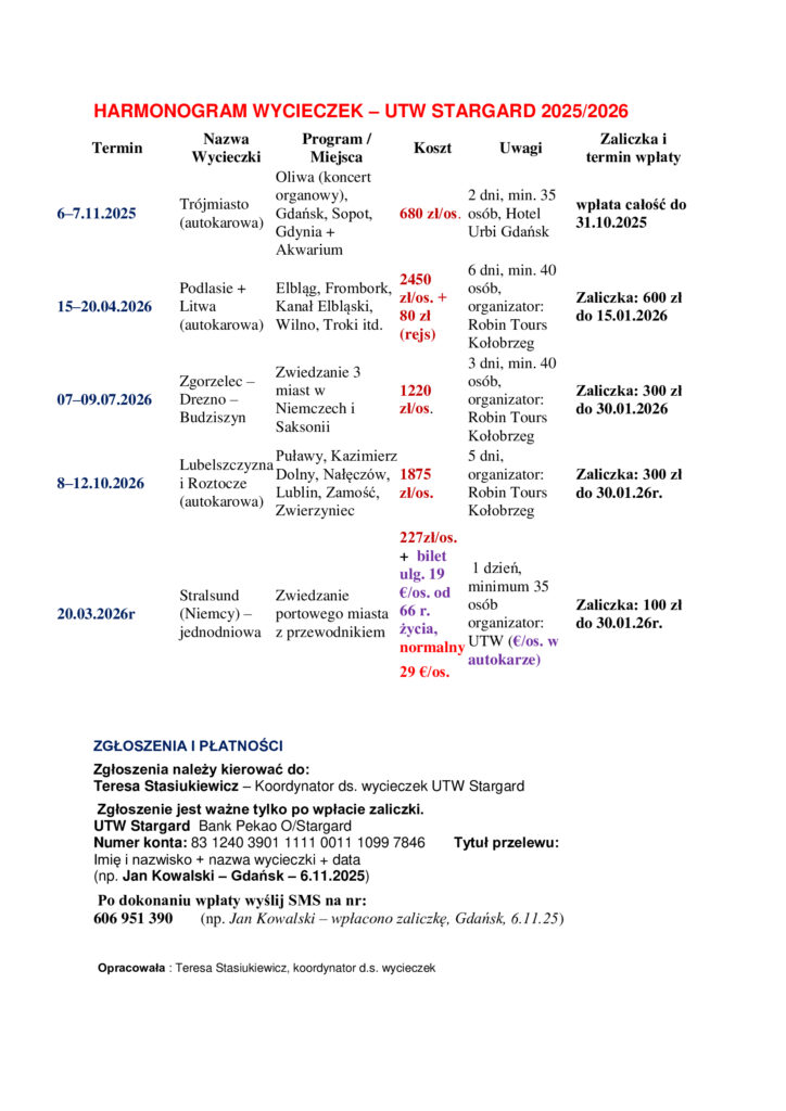 Home > Wycieczki > Wycieczki 2025 > HARMONOGRAM WYCIECZEK – UTW STARGARD 2025/2026