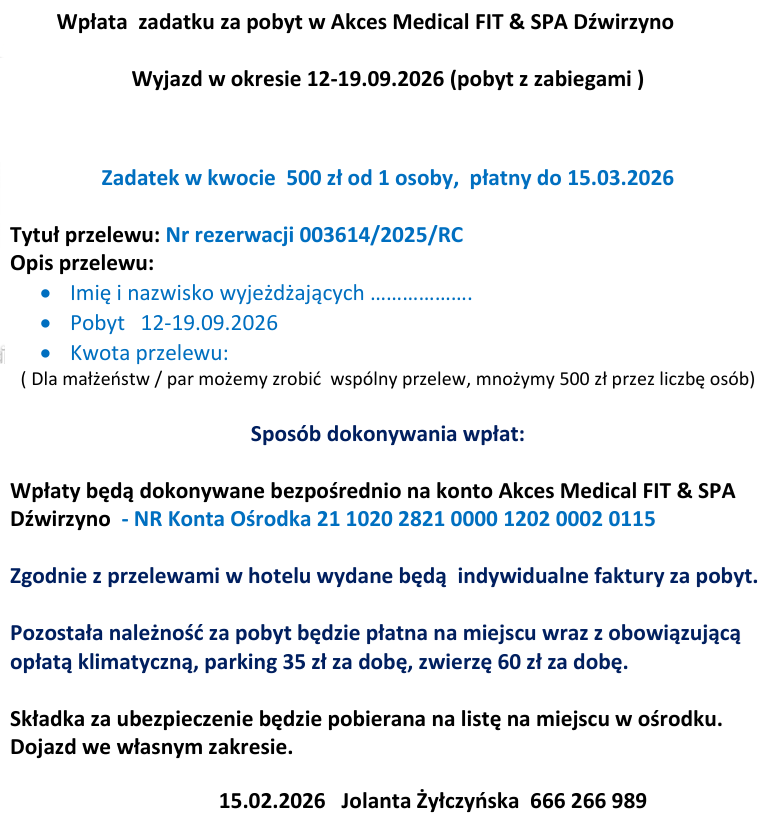 Konto do wpłat na wyjazdy wczasowo-rehabilitacyjne: 60 9387 1042 4207 5555 2000 0030