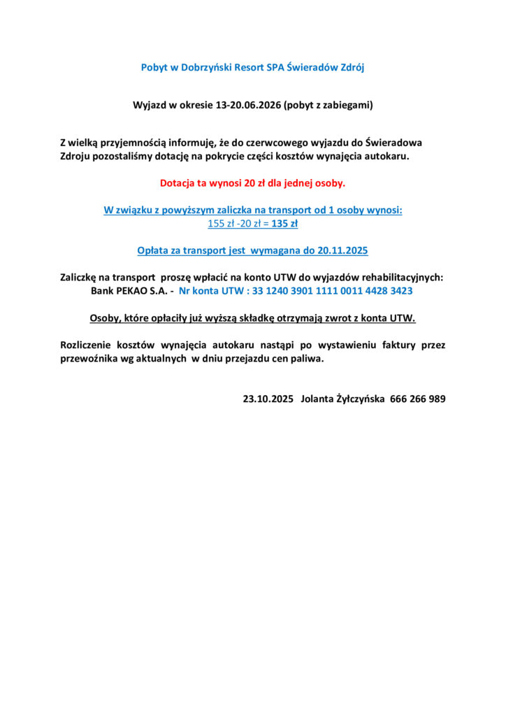 Konto do wpłat na wyjazdy wczasowo - rehabilitacyjne: Bank Pekao O/Stargard: 33 1240 3901 1111 0011 4428 3423