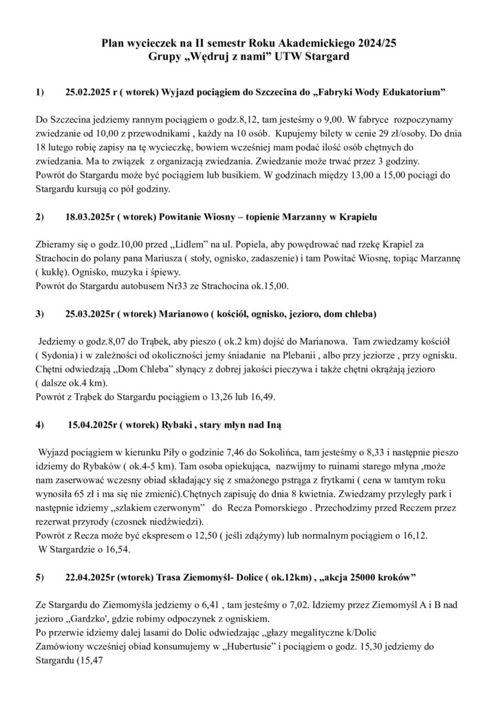 Plan wycieczek pieszych sekcji „Wędruj z Nami” w I i II semestrze 2024/2025