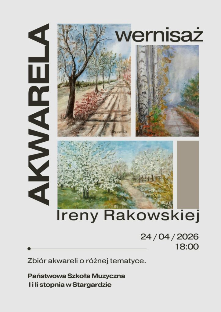Zapraszamy serdecznie na wernisaż wystawy akwareli autorstwa naszej koleżanki Ireny Rakowskiej – członkini Sekcji Plastycznej Uniwersytetu Trzeciego Wieku w Stargardzie.