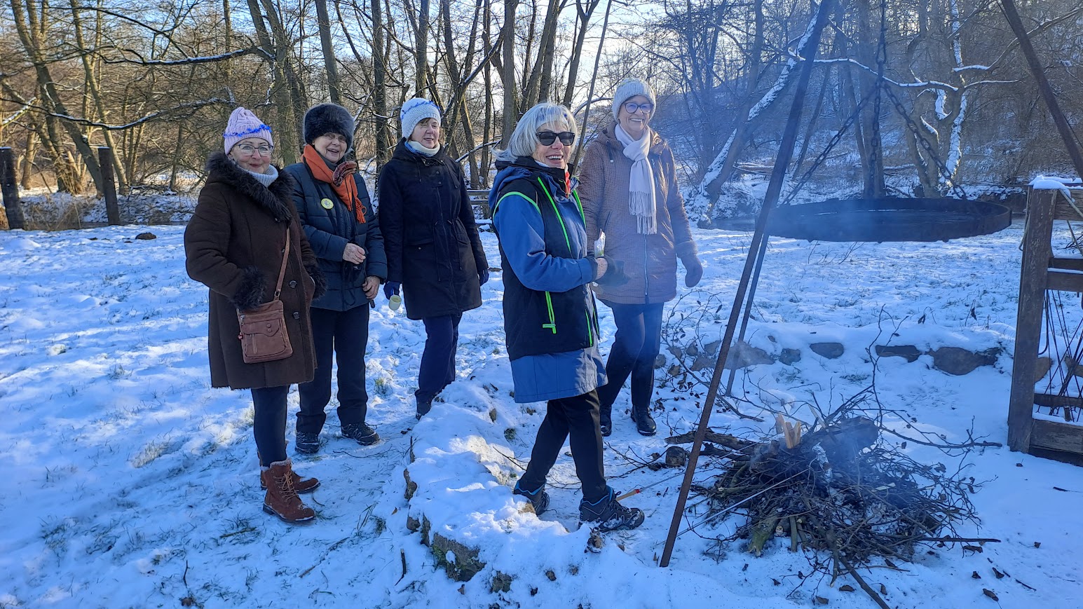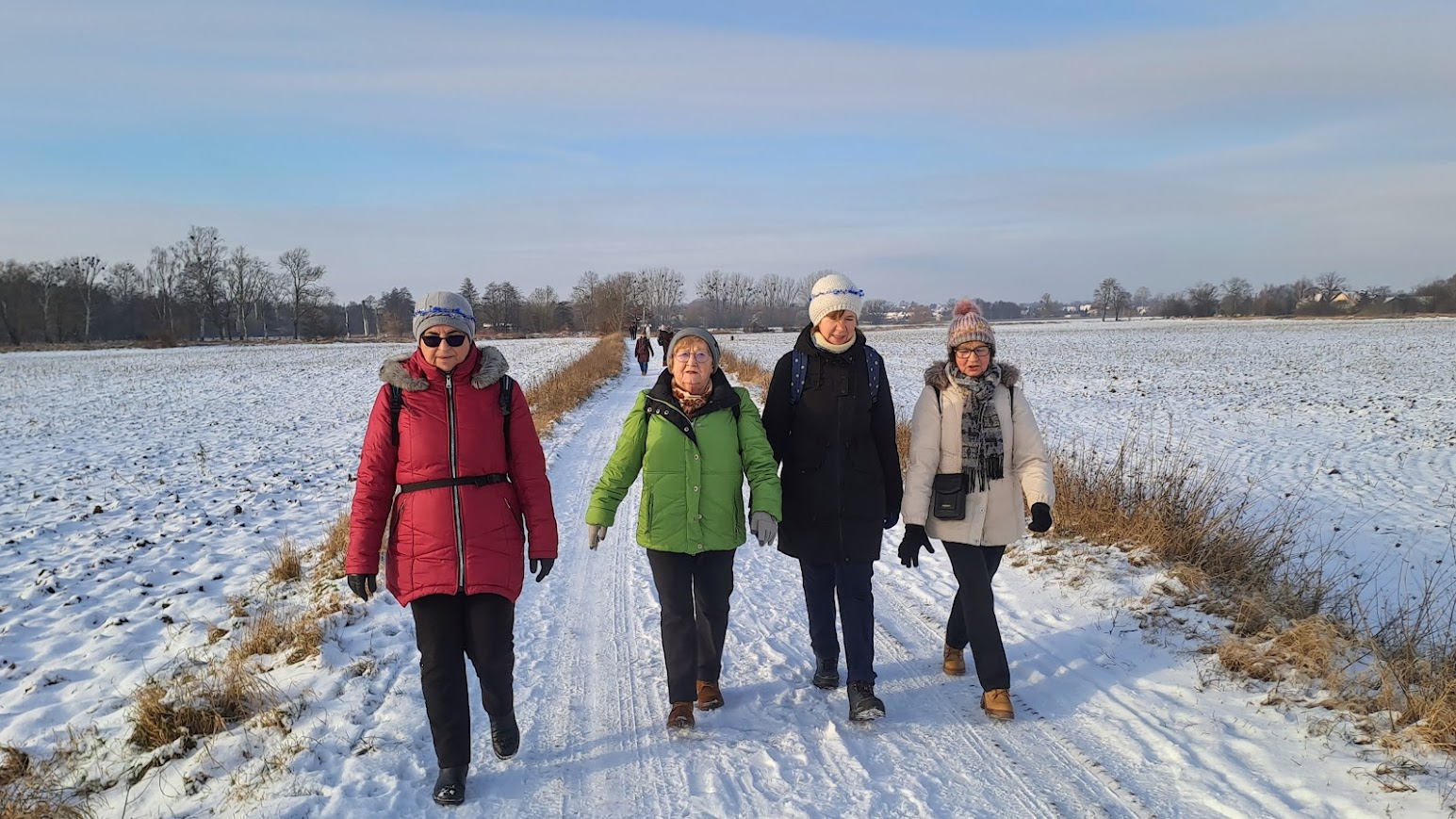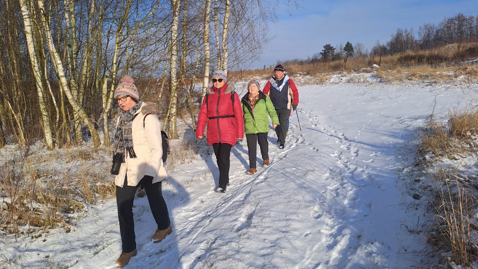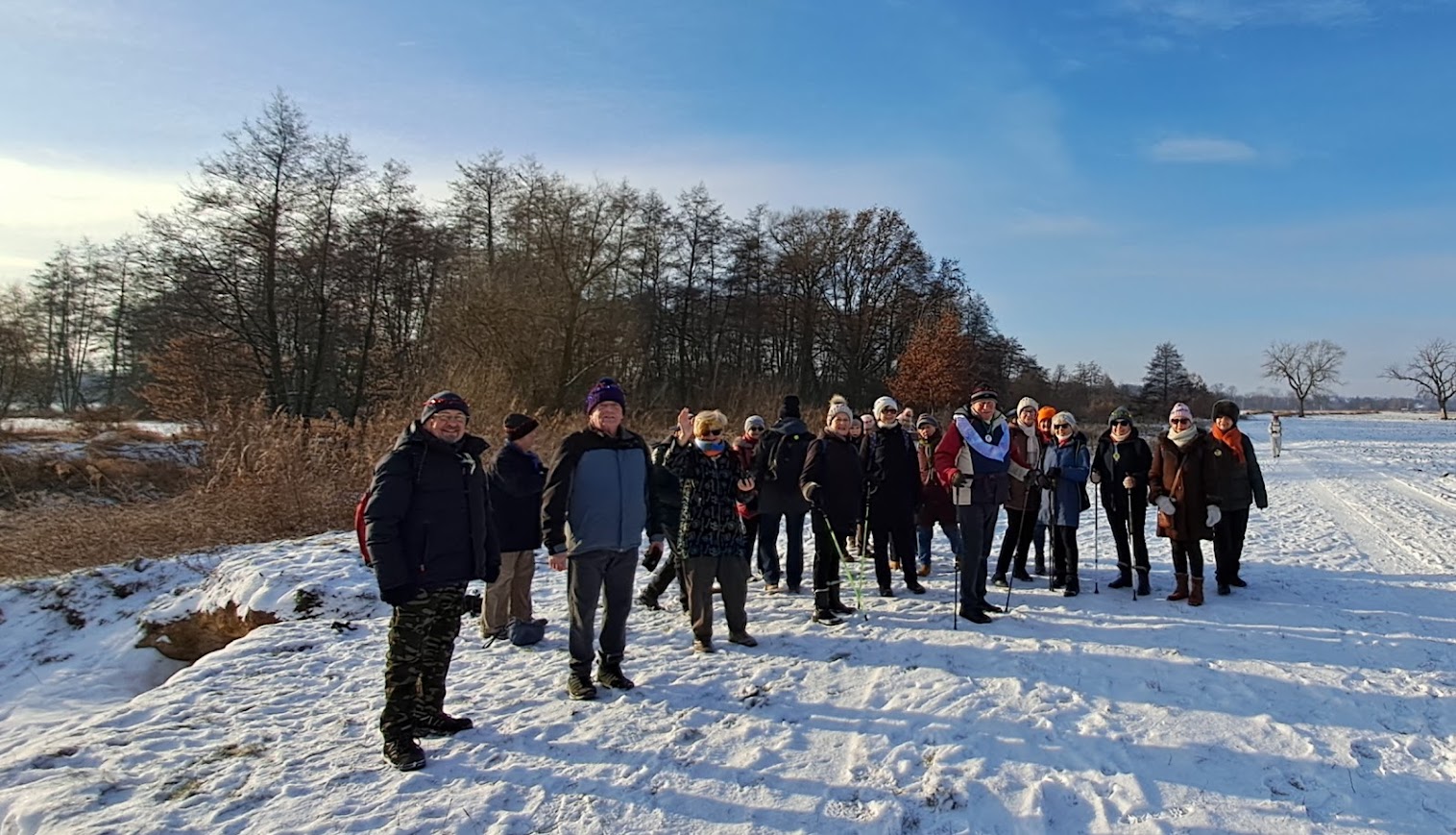 To była naprawdę piękna zimowa wycieczka. W Święto Trzech Króli, we wtorek 26 osób z naszej sekcji, zebrało się o godzinie 10,00 koło Lidla, aby wspólnie pójść na wycieczkę do Zielonej Doliny za Strachocinem i tam, przywitać Nowy 2026 Rok. Nasza niesamowita Kasia, przyniosła wszystkim, takie kolorowe koronki, które nałożyliśmy na swoje czapki i kaptury. W naszym gromie mieliśmy też prawdziwego Króla i to w dodatku Artura. Gdy się wszyscy zebrali, ruszyliśmy długim orszakiem w kierunku ulicy Wiejskiej i dalej, Nowowiejskiej. Później, po przejściu przez przejazd kolejowy i minięciu pomnikowego dębu, w pobliżu czerwonego mostku na rzece Krąpiel, skręciliśmy w lewo i szliśmy wzdłuż tej rzeki aż do samego Strachocina. Gdy wyszliśmy z ulic miasta i weszliśmy na polną drogę prowadząca wzdłuż rzeki, to dopiero wtedy można było zauważyć, jak pięknie jest zimą, gdy wokół jest biało od śniegu. Biało i czysto wszędzie. Po prawej stronie mieliśmy rzekę która zaczynała pokrywać się cienką warstwą lodu. W takiej zimowej scenerii to bardzo dawno nie szliśmy. Pogoda też nam dopisywała. Świeciło słońce i był lekki mrozik. W połowie drogi do Strachocina zrobiliśmy krótki postój na odpoczynek i aby cała nasza gromadka połączyła się. Po lewej stronie, jak szliśmy, daleko, widać było częściowo zaśnieżone dachy stargardzkiej kolegiaty i innych wyższych budowli. Cała dzisiejsza trasa wszystkim się podobała. Później, przeszliśmy przez Strachocin i weszliśmy ponownie na drogę polną która doprowadziła nas do Zielonej Doliny. Tym razem była to raczej biała dolina. Mieliśmy trudności z otwarciem szyfrowanej kłódki do doliny, bo kłódka po prostu zamarzła, ale znaleźliśmy inne dojście do celu naszej wycieczki. W dolinie, pod wiatą, wszyscy zajęli swoje miejsca. Nasz nadworny ogniomistrz rozpalił ognisko. Później przy stole szampańsko powitaliśmy Nowy Rok składając sobie nawzajem życzenia dobrego roku i dobrego zdrowia.. A że wśród nas był też jubilat Janek, to później były też i życzenia dla naszego kolegi Janka. Ognisko się paliło i biesiada nasza noworoczna trwała. Jak zwykle u nas, było bardzo wesoło i czas mijał nam bardzo szybko. Na godzinkę przed odjazdem autobusu zakończyliśmy naszą imprezę i ruszyliśmy w kierunku przystanku autobusowego w Strachocinie.