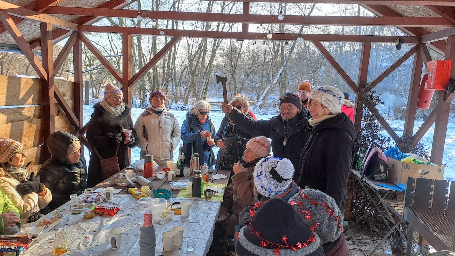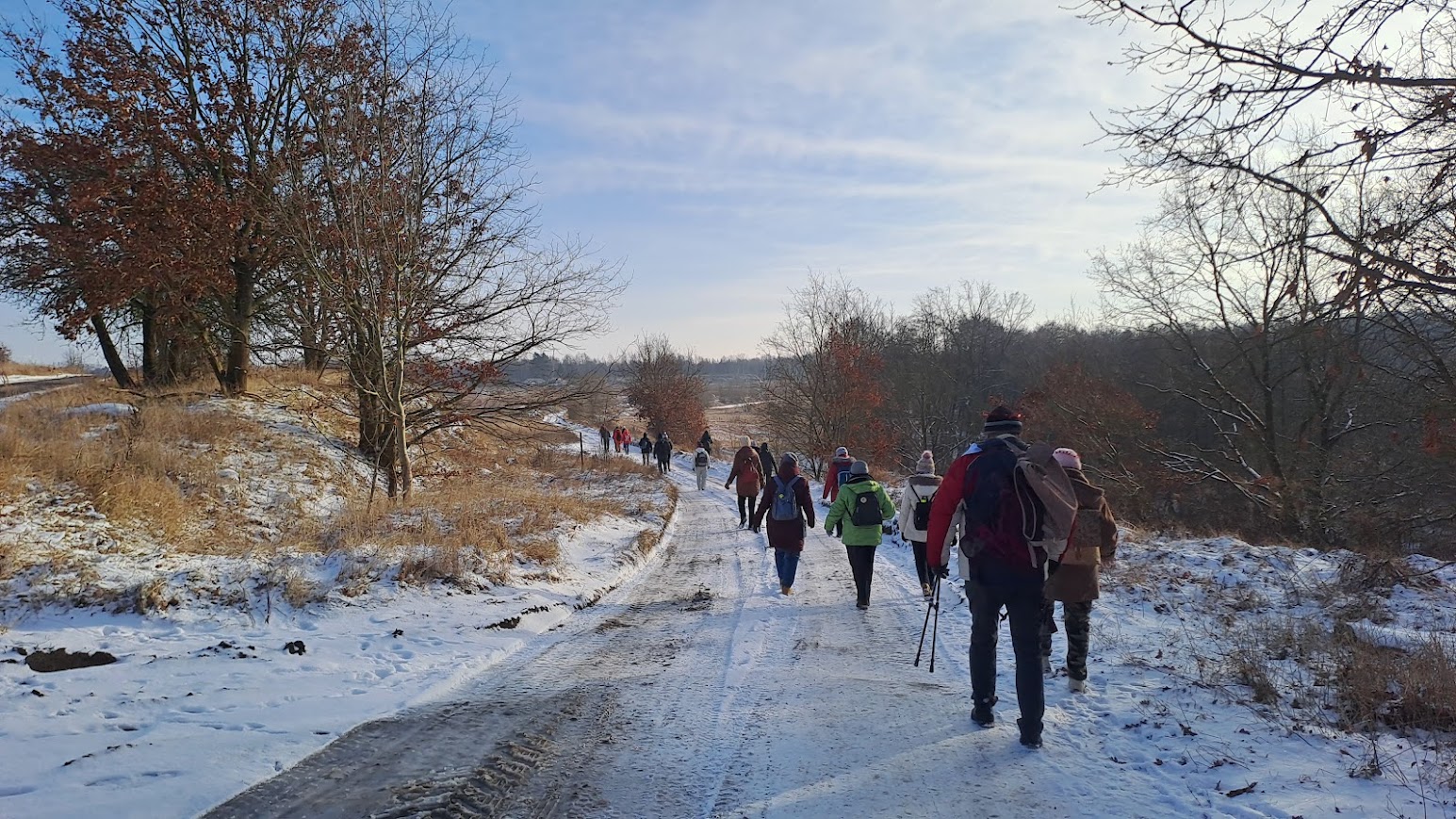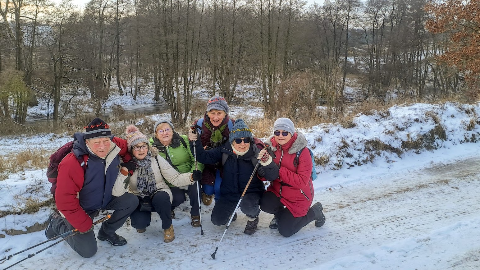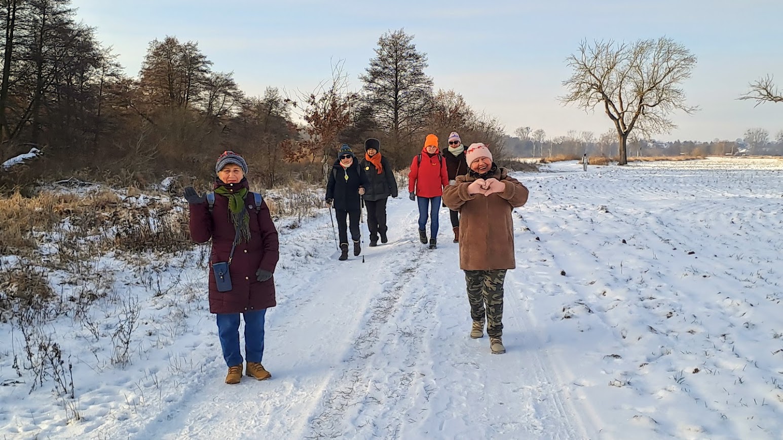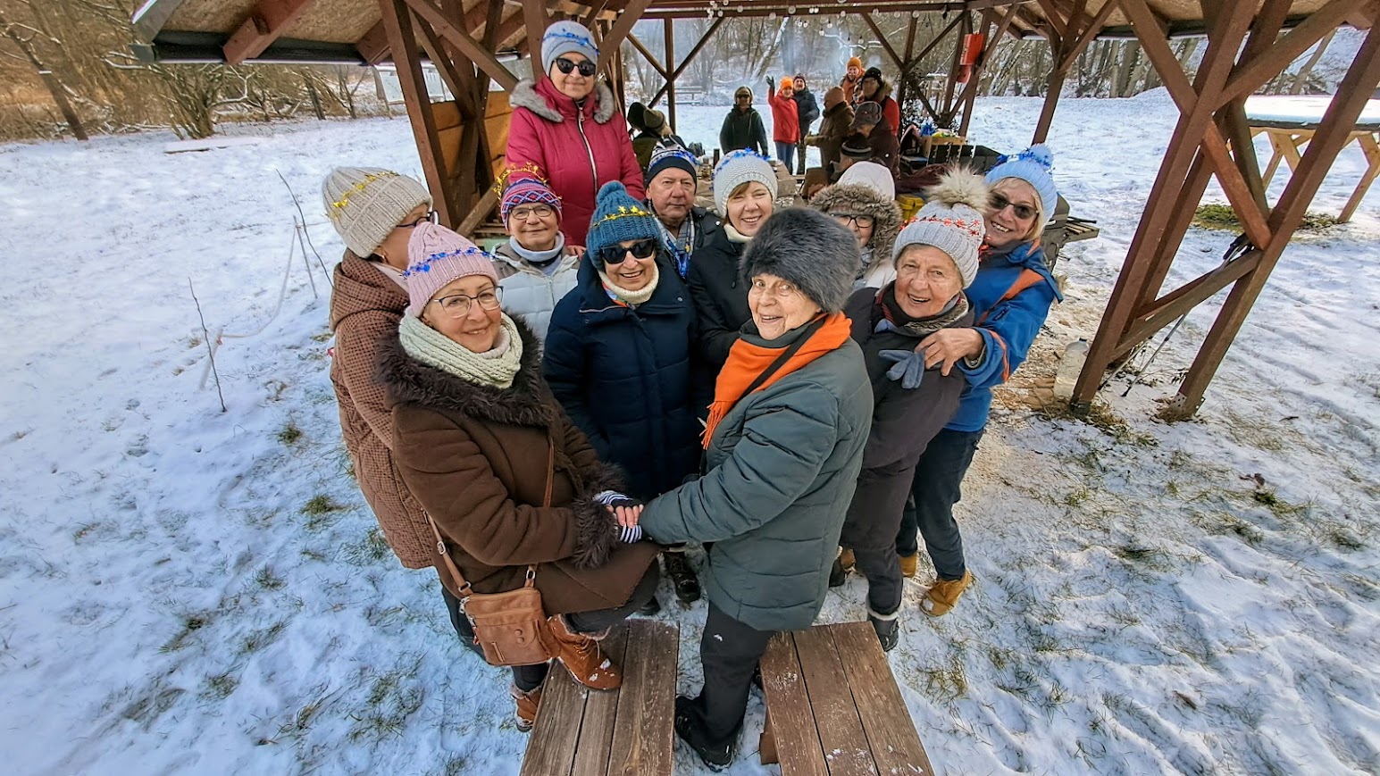 To była naprawdę piękna zimowa wycieczka. W Święto Trzech Króli, we wtorek 26 osób z naszej sekcji, zebrało się o godzinie 10,00 koło Lidla, aby wspólnie pójść na wycieczkę do Zielonej Doliny za Strachocinem i tam, przywitać Nowy 2026 Rok. Nasza niesamowita Kasia, przyniosła wszystkim, takie kolorowe koronki, które nałożyliśmy na swoje czapki i kaptury. W naszym gromie mieliśmy też prawdziwego Króla i to w dodatku Artura. Gdy się wszyscy zebrali, ruszyliśmy długim orszakiem w kierunku ulicy Wiejskiej i dalej, Nowowiejskiej. Później, po przejściu przez przejazd kolejowy i minięciu pomnikowego dębu, w pobliżu czerwonego mostku na rzece Krąpiel, skręciliśmy w lewo i szliśmy wzdłuż tej rzeki aż do samego Strachocina. Gdy wyszliśmy z ulic miasta i weszliśmy na polną drogę prowadząca wzdłuż rzeki, to dopiero wtedy można było zauważyć, jak pięknie jest zimą, gdy wokół jest biało od śniegu. Biało i czysto wszędzie. Po prawej stronie mieliśmy rzekę która zaczynała pokrywać się cienką warstwą lodu. W takiej zimowej scenerii to bardzo dawno nie szliśmy. Pogoda też nam dopisywała. Świeciło słońce i był lekki mrozik. W połowie drogi do Strachocina zrobiliśmy krótki postój na odpoczynek i aby cała nasza gromadka połączyła się. Po lewej stronie, jak szliśmy, daleko, widać było częściowo zaśnieżone dachy stargardzkiej kolegiaty i innych wyższych budowli. Cała dzisiejsza trasa wszystkim się podobała. Później, przeszliśmy przez Strachocin i weszliśmy ponownie na drogę polną która doprowadziła nas do Zielonej Doliny. Tym razem była to raczej biała dolina. Mieliśmy trudności z otwarciem szyfrowanej kłódki do doliny, bo kłódka po prostu zamarzła, ale znaleźliśmy inne dojście do celu naszej wycieczki. W dolinie, pod wiatą, wszyscy zajęli swoje miejsca. Nasz nadworny ogniomistrz rozpalił ognisko. Później przy stole szampańsko powitaliśmy Nowy Rok składając sobie nawzajem życzenia dobrego roku i dobrego zdrowia.. A że wśród nas był też jubilat Janek, to później były też i życzenia dla naszego kolegi Janka. Ognisko się paliło i biesiada nasza noworoczna trwała. Jak zwykle u nas, było bardzo wesoło i czas mijał nam bardzo szybko. Na godzinkę przed odjazdem autobusu zakończyliśmy naszą imprezę i ruszyliśmy w kierunku przystanku autobusowego w Strachocinie.