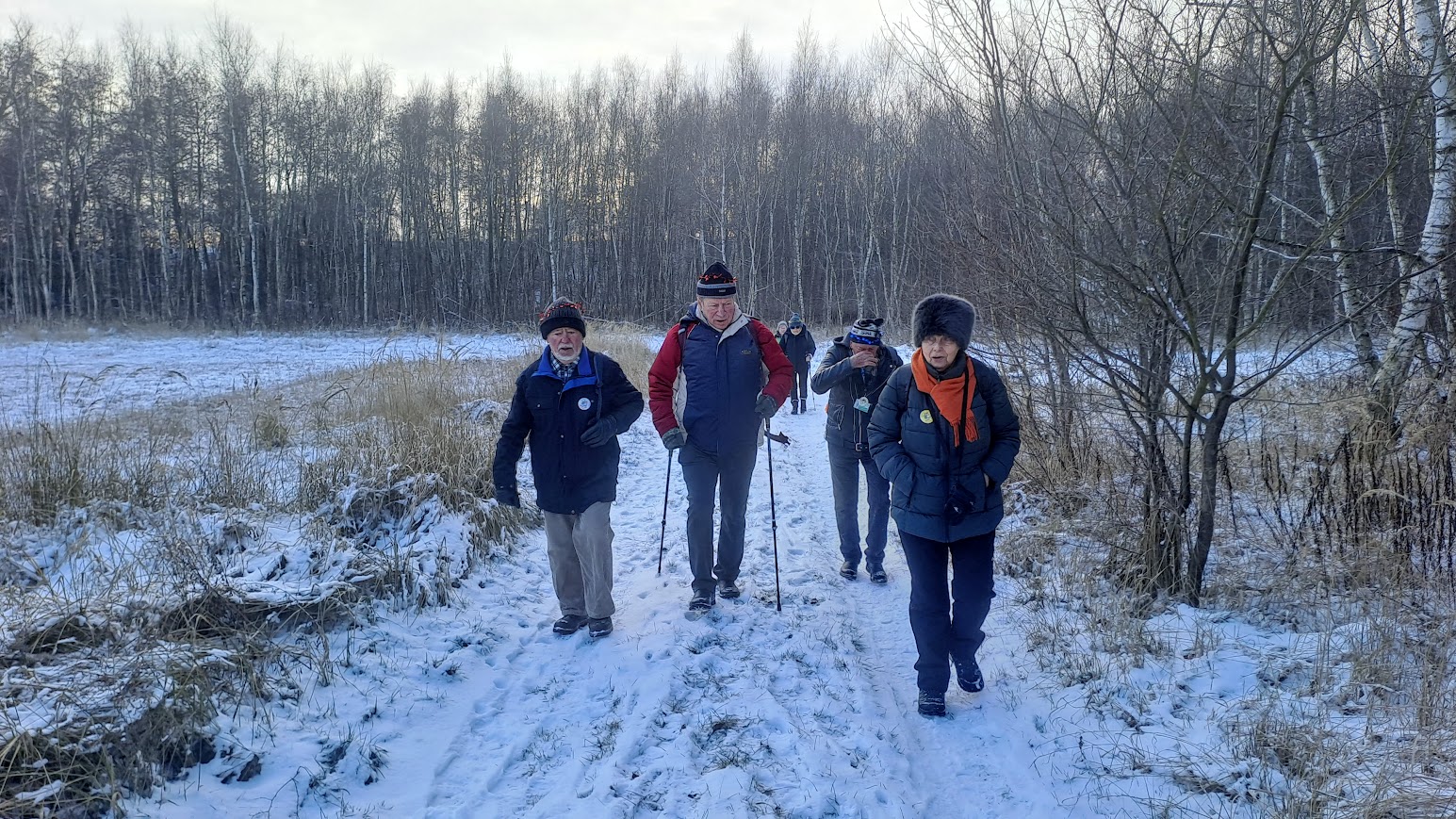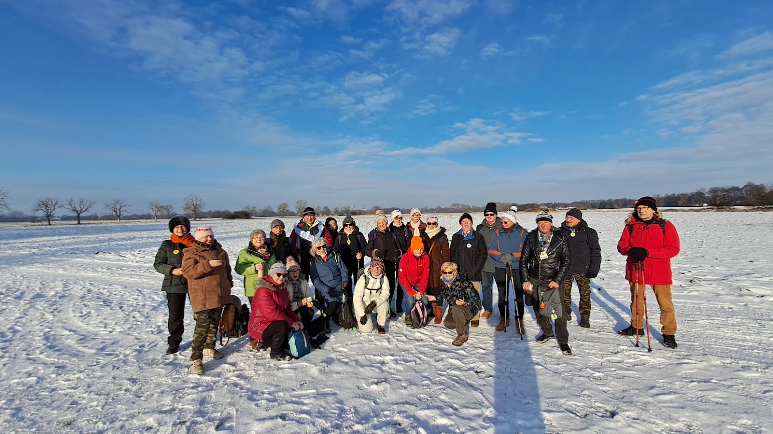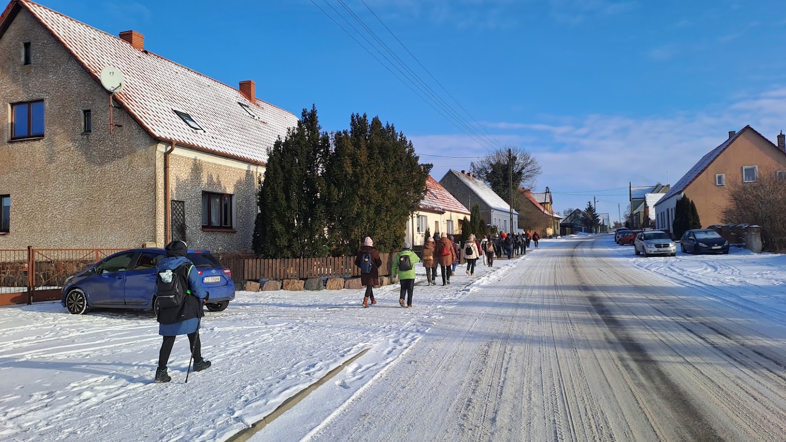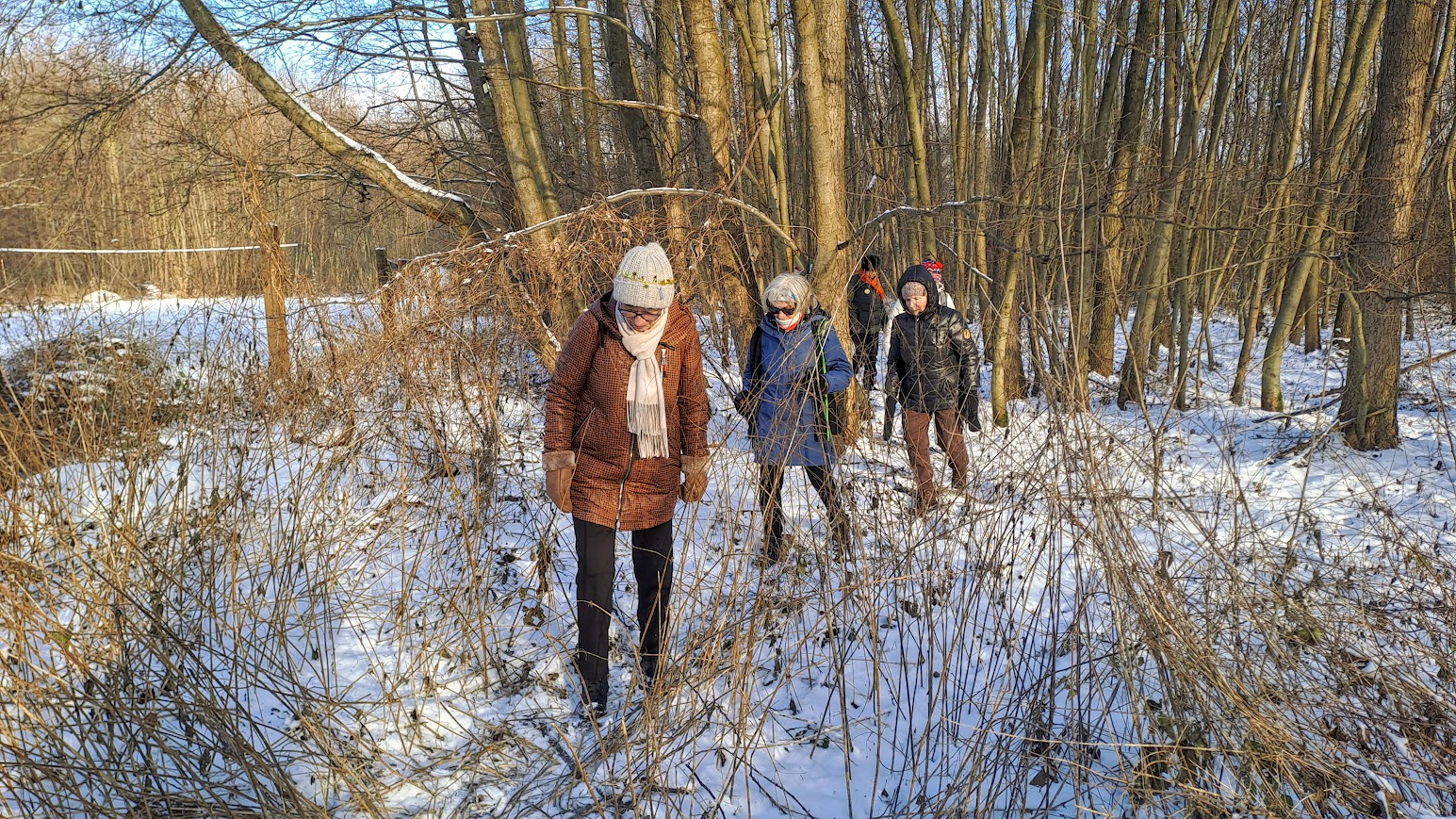 To była naprawdę piękna zimowa wycieczka. W Święto Trzech Króli, we wtorek 26 osób z naszej sekcji, zebrało się o godzinie 10,00 koło Lidla, aby wspólnie pójść na wycieczkę do Zielonej Doliny za Strachocinem i tam, przywitać Nowy 2026 Rok. Nasza niesamowita Kasia, przyniosła wszystkim, takie kolorowe koronki, które nałożyliśmy na swoje czapki i kaptury. W naszym gromie mieliśmy też prawdziwego Króla i to w dodatku Artura. Gdy się wszyscy zebrali, ruszyliśmy długim orszakiem w kierunku ulicy Wiejskiej i dalej, Nowowiejskiej. Później, po przejściu przez przejazd kolejowy i minięciu pomnikowego dębu, w pobliżu czerwonego mostku na rzece Krąpiel, skręciliśmy w lewo i szliśmy wzdłuż tej rzeki aż do samego Strachocina. Gdy wyszliśmy z ulic miasta i weszliśmy na polną drogę prowadząca wzdłuż rzeki, to dopiero wtedy można było zauważyć, jak pięknie jest zimą, gdy wokół jest biało od śniegu. Biało i czysto wszędzie. Po prawej stronie mieliśmy rzekę która zaczynała pokrywać się cienką warstwą lodu. W takiej zimowej scenerii to bardzo dawno nie szliśmy. Pogoda też nam dopisywała. Świeciło słońce i był lekki mrozik. W połowie drogi do Strachocina zrobiliśmy krótki postój na odpoczynek i aby cała nasza gromadka połączyła się. Po lewej stronie, jak szliśmy, daleko, widać było częściowo zaśnieżone dachy stargardzkiej kolegiaty i innych wyższych budowli. Cała dzisiejsza trasa wszystkim się podobała. Później, przeszliśmy przez Strachocin i weszliśmy ponownie na drogę polną która doprowadziła nas do Zielonej Doliny. Tym razem była to raczej biała dolina. Mieliśmy trudności z otwarciem szyfrowanej kłódki do doliny, bo kłódka po prostu zamarzła, ale znaleźliśmy inne dojście do celu naszej wycieczki. W dolinie, pod wiatą, wszyscy zajęli swoje miejsca. Nasz nadworny ogniomistrz rozpalił ognisko. Później przy stole szampańsko powitaliśmy Nowy Rok składając sobie nawzajem życzenia dobrego roku i dobrego zdrowia.. A że wśród nas był też jubilat Janek, to później były też i życzenia dla naszego kolegi Janka. Ognisko się paliło i biesiada nasza noworoczna trwała. Jak zwykle u nas, było bardzo wesoło i czas mijał nam bardzo szybko. Na godzinkę przed odjazdem autobusu zakończyliśmy naszą imprezę i ruszyliśmy w kierunku przystanku autobusowego w Strachocinie.