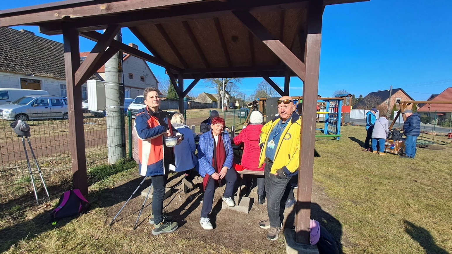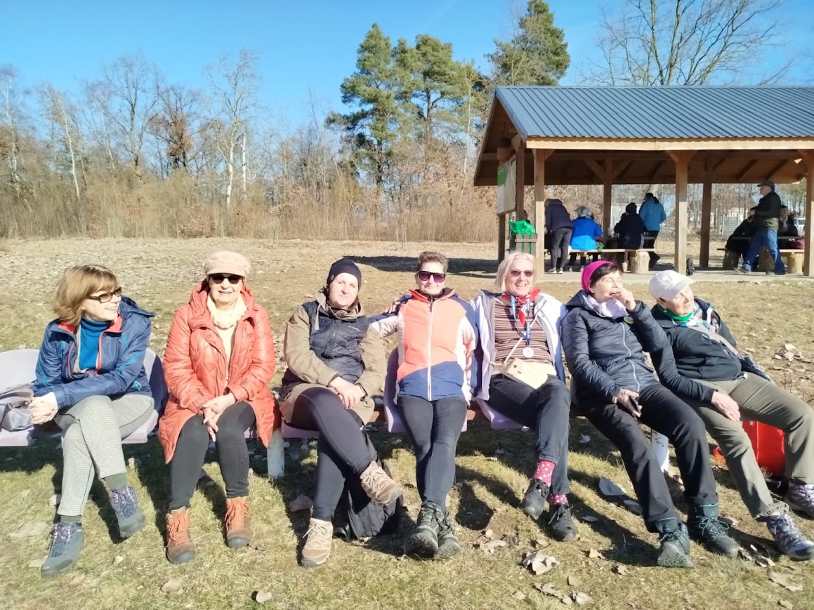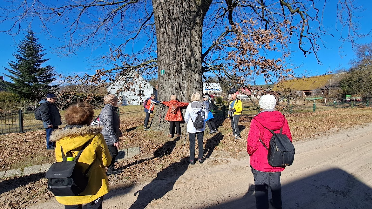 We wtorek zebraliśmy się na ZCP o godzinie 9,14 i ruszyliśmy autobusem nr 11 do pętli na ul. Kossaka. Tam na nas czekała Krysia która niedaleko od tego przystanku mieszka. Policzyliśmy się, a było nas 25 osób i ruszyliśmy pieszo ścieżka rowerową w kierunku Żarowa. Po chłodnym poranku, słoneczko zaczynało coraz mocniej przygrzewać. Zaczynało nam być nawet gorąco. Poza tym, marsz ścieżką rowerową zaczynał być dosyć męczący i trochę taki nudnawy. Po drodze, widać było ile to nowych domów na styku Stargardu z Żarowem, powstaje. Jeszcze nie tak dawno na tym terenie królowały pola. Widząc, że jest nam coraz cieplej i zmęczenie też zaczynało się wkradać, postanowiliśmy, w Żarowie, na placu zabaw, zrobić sobie krótki odpoczynek. Irenka poczęstowała nas przy okazji, ostatnią w tym roku energetyczną herbatką. Odpoczynek się bardzo nam przydał i po kilkunastu minutach ruszyliśmy dalej. Za Żarowem weszliśmy na leśną drogę. Stało się od razu dużo chłodniej, a i trasa stała się też bardziej atrakcyjna, bo z dala od ulic. Dla wielu, była to zupełnie nowa trasa. Gdy tak sobie szliśmy, w pewnym miejscu napotkaliśmy dosyć solidne blotka, ale na szczęście nie było tego zbyt dużo. Niektóre, kałuże były nawet pokryte cienkim lodem. Gdy już skręciliśmy w kierunku Rogowa, to ukazała się nam nasza rzeka Ina. W tym rejonie wygląda ona bardzo okazale. Dzika rzeka z powalonymi konarami drzew w nurcie. Liści na drzewach jeszcze nie ma, więc widok na bieg Iny był naprawdę bardzo ciekawy. Doszliśmy do mostku pieszo-rowerowego na Inie. Tam zrobiliśmy sobie pamiątkową fotkę i po przejściu na druga stronę znaleźliśmy się w Rogowie. Rogowo to bardzo ciekawa wieś. Niewielka mieścina, ale dzięki mieszkańcom i pani sołtys, ładnie urządzona i bardzo zadbana. Na ulicy, po obu stronach, przed obejściami, ciekawe kwietniki, sporo innych instalacji, a na końcu wsi ,dobrze zadbamy stadion sportowy. Atrakcją Rogowa są też potężne pomnikowe dęby „Jan” i „Jaś”. Aby zmierzyć obwód „Jana”, to siedem osób musiało wziąć się za ręce i go objąć. Piękne drzewa. Teraz bez liści, można więc było obejrzeć piękne rozłożyste konary i całą koronę drzew. We wsi znajduje się też stary ewangelicki cmentarz, pozostałości po dawnym dworze właścicieli i uporządkowany park dworski. Po przejściu przez wieś, na boisku, zrobiliśmy sobie długą przerwę na odpoczynek. Nasze koleżanki spragnione słońca szybko zajęły miejsca na ławeczkach, kierując swoje liczka do słońca. Po ponad godzinie poszliśmy dalej, do Lubowa. Szliśmy starą drogą po której samochody jeżdżą bardzo rzadko. Dawniej, ta droga była wysadzona drzewami owocowymi. Po dwóch kilometrach dotarliśmy do Lubowa. Tam, ponownie przeszliśmy, po moście drogowym, nad Iną i skierowaliśmy się w stronę Żarowa. W Żarowie zamknęliśmy jakby pętlę naszej wycieczki. Kilometrów w nogach mieliśmy już sporo. Pogoda też troszkę męczyła, bo na styku zimy i wiosny często objawia się tzw. „zmęczenie wiosenne”. Większość z naszej gromadki poczekała w Żarowie na autobus. Kilka osób poszło dalej pieszo w kierunku pętli na Kossaka i dalej do samego Stargardu. Kolejna nasza wycieczka skończyła się. Najwytrwalsi przeszli dzisiaj ponad 16 kilometrów.