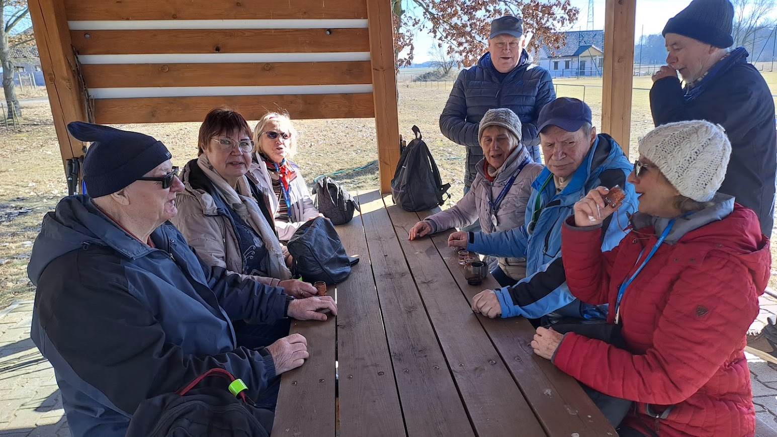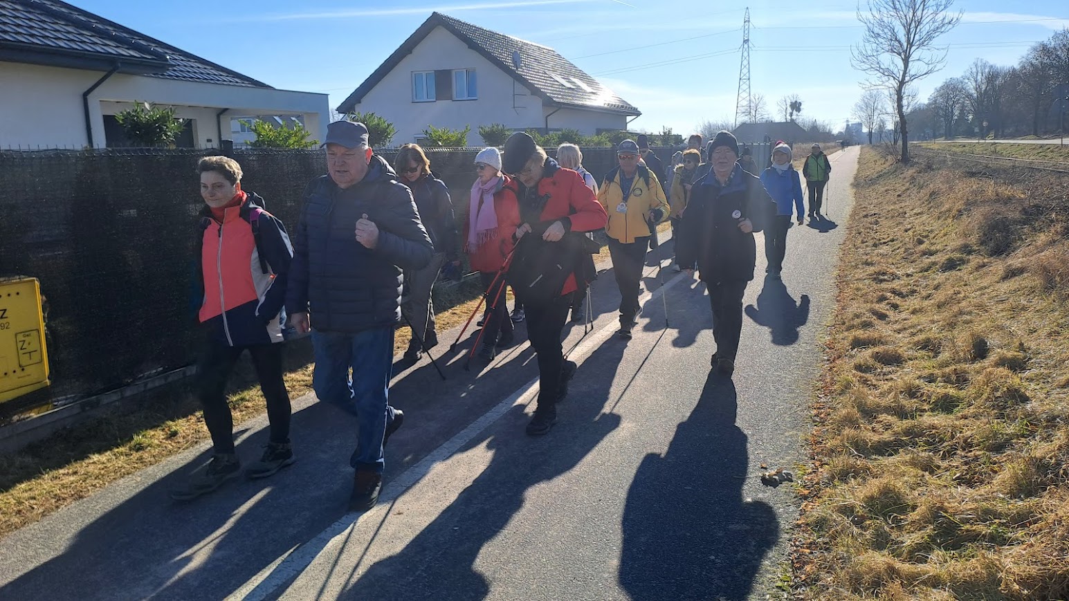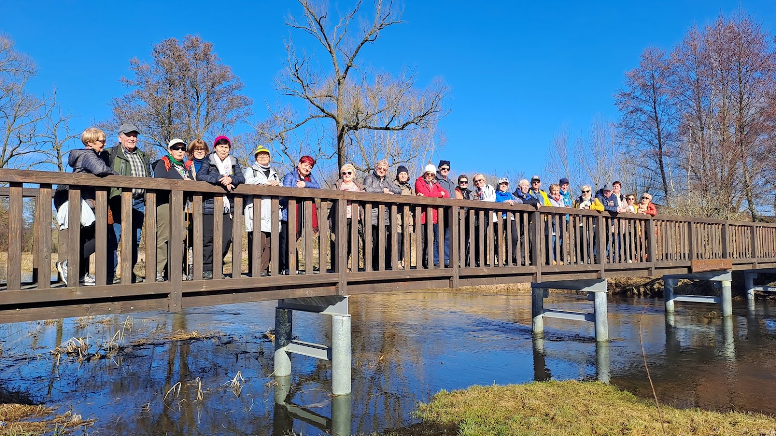 We wtorek zebraliśmy się na ZCP o godzinie 9,14 i ruszyliśmy autobusem nr 11 do pętli na ul. Kossaka. Tam na nas czekała Krysia która niedaleko od tego przystanku mieszka. Policzyliśmy się, a było nas 25 osób i ruszyliśmy pieszo ścieżka rowerową w kierunku Żarowa. Po chłodnym poranku, słoneczko zaczynało coraz mocniej przygrzewać. Zaczynało nam być nawet gorąco. Poza tym, marsz ścieżką rowerową zaczynał być dosyć męczący i trochę taki nudnawy. Po drodze, widać było ile to nowych domów na styku Stargardu z Żarowem, powstaje. Jeszcze nie tak dawno na tym terenie królowały pola. Widząc, że jest nam coraz cieplej i zmęczenie też zaczynało się wkradać, postanowiliśmy, w Żarowie, na placu zabaw, zrobić sobie krótki odpoczynek. Irenka poczęstowała nas przy okazji, ostatnią w tym roku energetyczną herbatką. Odpoczynek się bardzo nam przydał i po kilkunastu minutach ruszyliśmy dalej. Za Żarowem weszliśmy na leśną drogę. Stało się od razu dużo chłodniej, a i trasa stała się też bardziej atrakcyjna, bo z dala od ulic. Dla wielu, była to zupełnie nowa trasa. Gdy tak sobie szliśmy, w pewnym miejscu napotkaliśmy dosyć solidne blotka, ale na szczęście nie było tego zbyt dużo. Niektóre, kałuże były nawet pokryte cienkim lodem. Gdy już skręciliśmy w kierunku Rogowa, to ukazała się nam nasza rzeka Ina. W tym rejonie wygląda ona bardzo okazale. Dzika rzeka z powalonymi konarami drzew w nurcie. Liści na drzewach jeszcze nie ma, więc widok na bieg Iny był naprawdę bardzo ciekawy. Doszliśmy do mostku pieszo-rowerowego na Inie. Tam zrobiliśmy sobie pamiątkową fotkę i po przejściu na druga stronę znaleźliśmy się w Rogowie. Rogowo to bardzo ciekawa wieś. Niewielka mieścina, ale dzięki mieszkańcom i pani sołtys, ładnie urządzona i bardzo zadbana. Na ulicy, po obu stronach, przed obejściami, ciekawe kwietniki, sporo innych instalacji, a na końcu wsi ,dobrze zadbamy stadion sportowy. Atrakcją Rogowa są też potężne pomnikowe dęby „Jan” i „Jaś”. Aby zmierzyć obwód „Jana”, to siedem osób musiało wziąć się za ręce i go objąć. Piękne drzewa. Teraz bez liści, można więc było obejrzeć piękne rozłożyste konary i całą koronę drzew. We wsi znajduje się też stary ewangelicki cmentarz, pozostałości po dawnym dworze właścicieli i uporządkowany park dworski. Po przejściu przez wieś, na boisku, zrobiliśmy sobie długą przerwę na odpoczynek. Nasze koleżanki spragnione słońca szybko zajęły miejsca na ławeczkach, kierując swoje liczka do słońca. Po ponad godzinie poszliśmy dalej, do Lubowa. Szliśmy starą drogą po której samochody jeżdżą bardzo rzadko. Dawniej, ta droga była wysadzona drzewami owocowymi. Po dwóch kilometrach dotarliśmy do Lubowa. Tam, ponownie przeszliśmy, po moście drogowym, nad Iną i skierowaliśmy się w stronę Żarowa. W Żarowie zamknęliśmy jakby pętlę naszej wycieczki. Kilometrów w nogach mieliśmy już sporo. Pogoda też troszkę męczyła, bo na styku zimy i wiosny często objawia się tzw. „zmęczenie wiosenne”. Większość z naszej gromadki poczekała w Żarowie na autobus. Kilka osób poszło dalej pieszo w kierunku pętli na Kossaka i dalej do samego Stargardu. Kolejna nasza wycieczka skończyła się. Najwytrwalsi przeszli dzisiaj ponad 16 kilometrów.