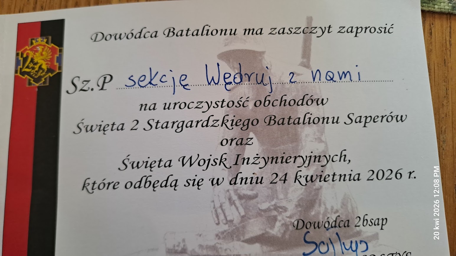 W dniu 24.04.2026 roku przedstawiciele naszej sekcji, „Wędruj z Nami” uczestniczyli, po raz kolejny (trzeci), w uroczystościach rocznicowych 2-giego Stargardzkiego Batalionu Saperów. Zaproszenie do naszej sekcji skierował dowódca 2-giego Batalionu Saperów w Stargardzie. Zebraliśmy się przy bramie głównej starego cmentarza 24 kwietnia o godzinie 9,45. Następnie udaliśmy się do Kwatery Saperów, gdzie odbył się apel i oddana została salwa honorowa. Nasz kolega Władek, w naszym imieniu, złożył wiązankę kwiatów pod tablicą poświęconą naszym Saperom.