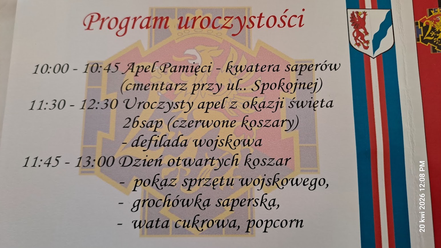 Z dowódcą jednostki, na terenie cmentarza, zrobiliśmy sobie pamiątkowe zdjęcie. Następnie wszyscy udali się na teren Czerwonych Koszar. Tam, mogliśmy obejrzeć sprzęt wojskowy służący saperom i żołnierzom strzegącym granic naszego państwa. Odbyła się też defilada pododdziałów z Batalionu Saperów.