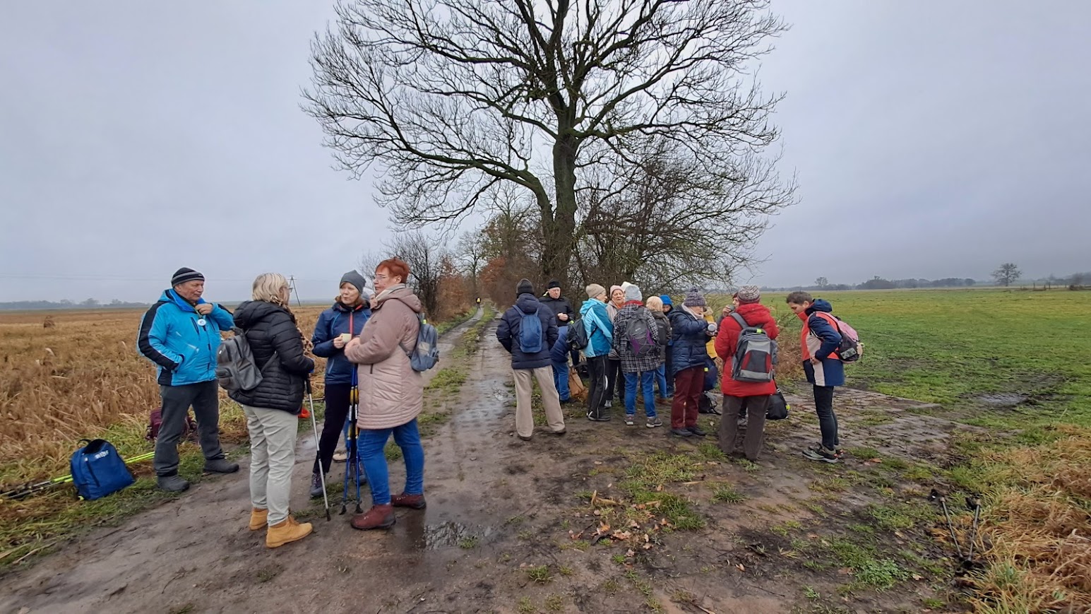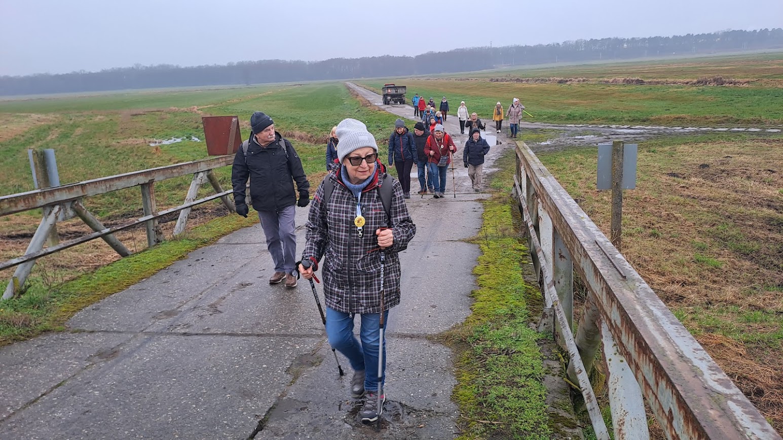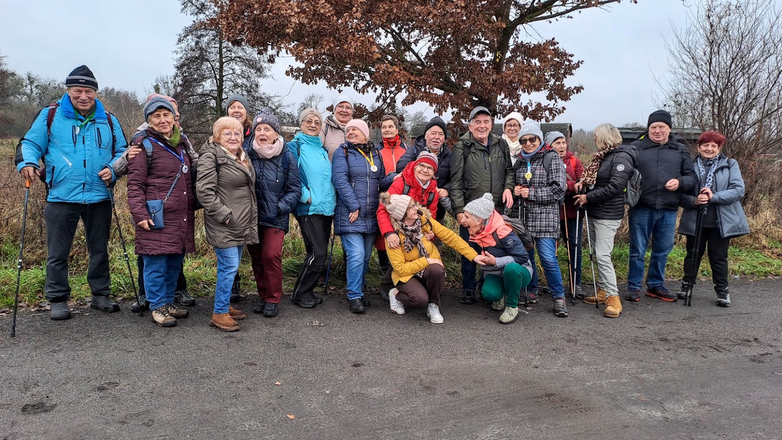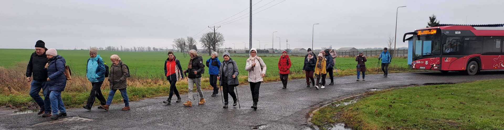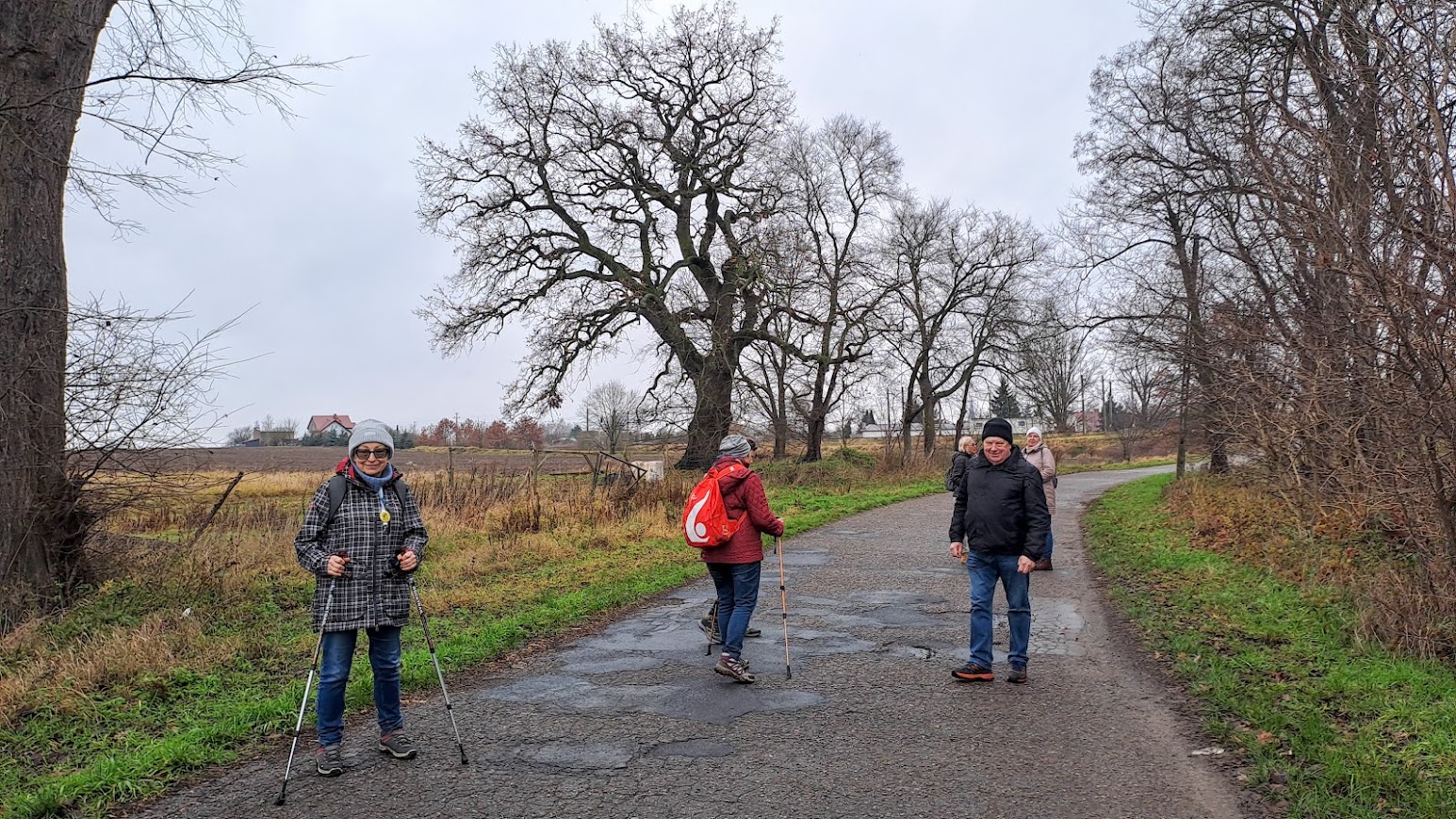 We wtorek 09.12.2025 r, pomimo fatalnych prognoz pogodowych, nasza niezawodna, wędrująca gromada, w liczbie 23 uczestników, wybrała się na wycieczkę po witkowskich łąkach. Ze Stargardu pojechaliśmy autobusem nr 30 do Witkowa i stamtąd wyruszyliśmy pieszo, drogą prowadzącą przez witkowskie łąki. Jesienią jest tam bardzo cicho, brak śpiewających ptaków . Niemniej udało się nam zauważyć jeden klucz lecących gęsi i dwa niewielkie stada łabędzi. Pogoda mglista z temperaturą ponad 10 stopni, co jest pewną anomalią w grudniu, więc ptaki też zmieniają swoje miejsca pobytu. Przeszliśmy przez most na rzece Inie i poszliśmy dalej drogą, która po pewnym czasie skręcała w kierunku Stargardu. Na rozstaju dróg mieliśmy króciutki postój aby posilić się energetyczną herbatką serwowaną przez naszą Irenkę. Początkowo szliśmy prawie suchą drogą wyłożoną płytami jumbo, aż do przejścia przez tunel dla zwierząt pod S10. Po obu stronach rozciągały się rozległe witkowskie łąki, nawet jeszcze zielone, o tej porze roku. Za tunelem , weszliśmy w teren trochę zadrzewiony, gdzie zaczęło się dosyć mocne błotko na naszej drodze. Szliśmy gęsiego uważając, aby nie wpaść w jakąś błotnistą kałużę, lub się nie poślizgnąć. Ale daliśmy radę i jakoś wszyscy sprawnie doszliśmy do miejsca bardziej suchego, gdzie zatrzymaliśmy się na dłuższy odpoczynek. Tym razem ogniska nie rozpalaliśmy, bo wszystko było bardzo mokre po nocnych opadach deszczu. Dalej, to już była dosyć wygodna droga prowadząca obok przepływającej rzeki Krąpiel, aż do czerwonego mostku. Później przeszliśmy koło pomnikowego dębu i dalej przez przejazd kolejowy i doszliśmy do ulicy Nowowiejskiej.