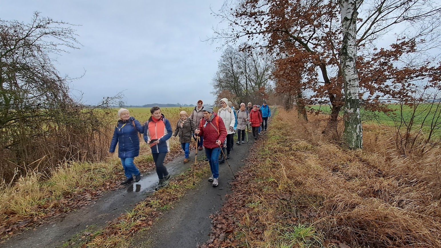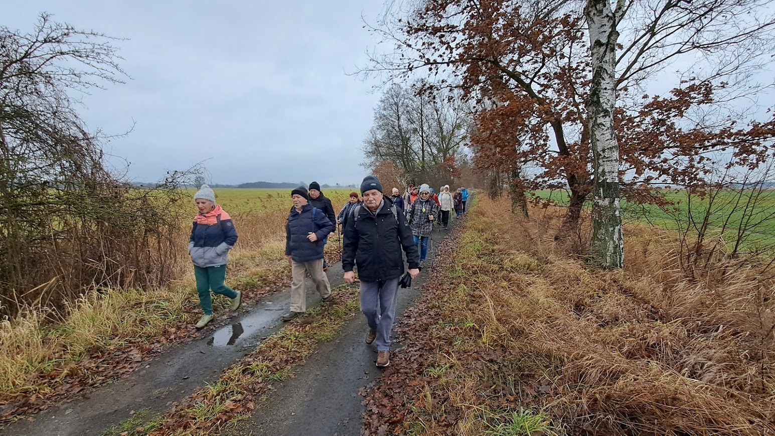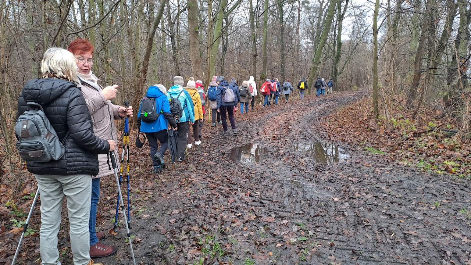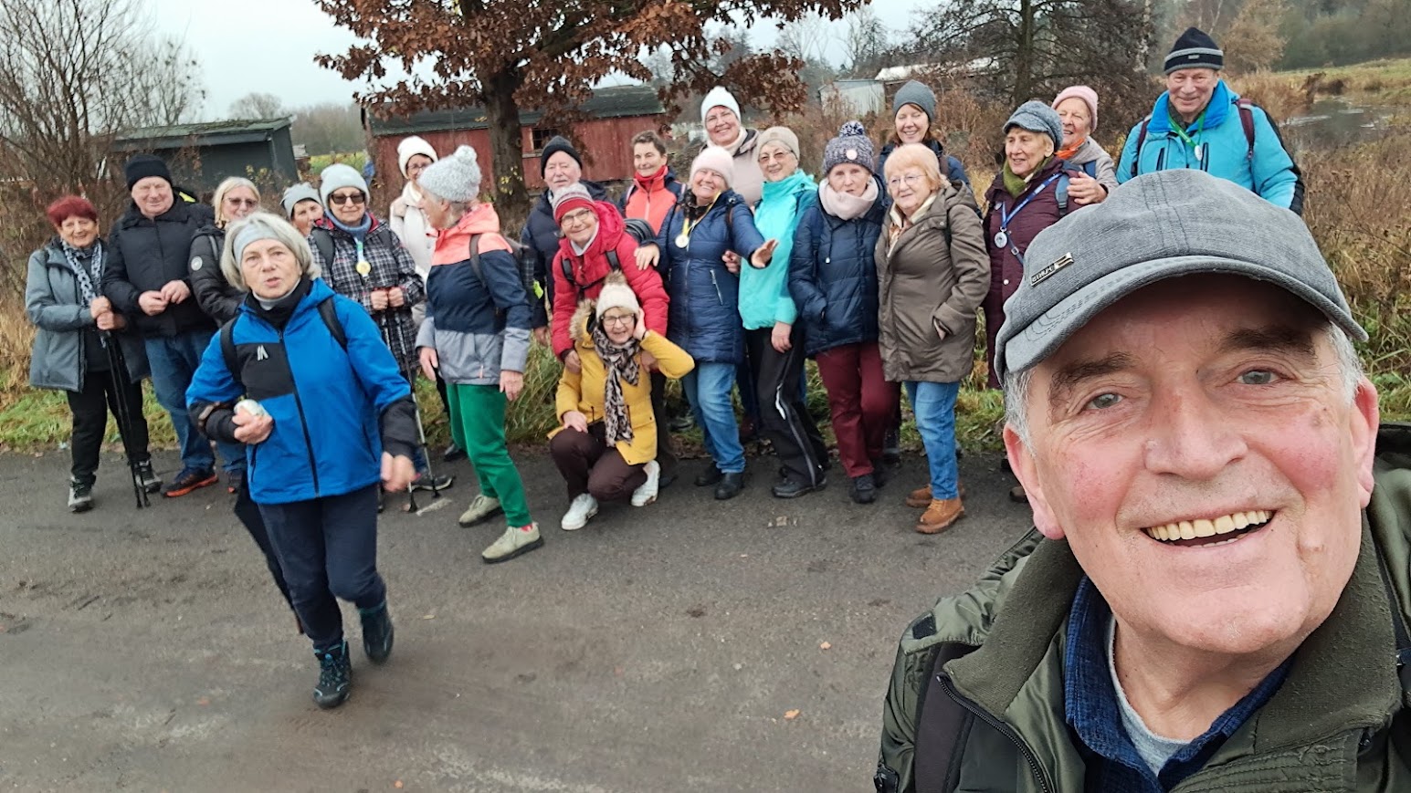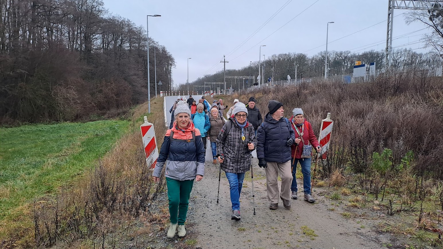 We wtorek 09.12.2025 r, pomimo fatalnych prognoz pogodowych, nasza niezawodna, wędrująca gromada, w liczbie 23 uczestników, wybrała się na wycieczkę po witkowskich łąkach. Ze Stargardu pojechaliśmy autobusem nr 30 do Witkowa i stamtąd wyruszyliśmy pieszo, drogą prowadzącą przez witkowskie łąki. Jesienią jest tam bardzo cicho, brak śpiewających ptaków . Niemniej udało się nam zauważyć jeden klucz lecących gęsi i dwa niewielkie stada łabędzi. Pogoda mglista z temperaturą ponad 10 stopni, co jest pewną anomalią w grudniu, więc ptaki też zmieniają swoje miejsca pobytu. Przeszliśmy przez most na rzece Inie i poszliśmy dalej drogą, która po pewnym czasie skręcała w kierunku Stargardu. Na rozstaju dróg mieliśmy króciutki postój aby posilić się energetyczną herbatką serwowaną przez naszą Irenkę. Początkowo szliśmy prawie suchą drogą wyłożoną płytami jumbo, aż do przejścia przez tunel dla zwierząt pod S10. Po obu stronach rozciągały się rozległe witkowskie łąki, nawet jeszcze zielone, o tej porze roku. Za tunelem , weszliśmy w teren trochę zadrzewiony, gdzie zaczęło się dosyć mocne błotko na naszej drodze. Szliśmy gęsiego uważając, aby nie wpaść w jakąś błotnistą kałużę, lub się nie poślizgnąć. Ale daliśmy radę i jakoś wszyscy sprawnie doszliśmy do miejsca bardziej suchego, gdzie zatrzymaliśmy się na dłuższy odpoczynek. Tym razem ogniska nie rozpalaliśmy, bo wszystko było bardzo mokre po nocnych opadach deszczu. Dalej, to już była dosyć wygodna droga prowadząca obok przepływającej rzeki Krąpiel, aż do czerwonego mostku. Później przeszliśmy koło pomnikowego dębu i dalej przez przejazd kolejowy i doszliśmy do ulicy Nowowiejskiej.