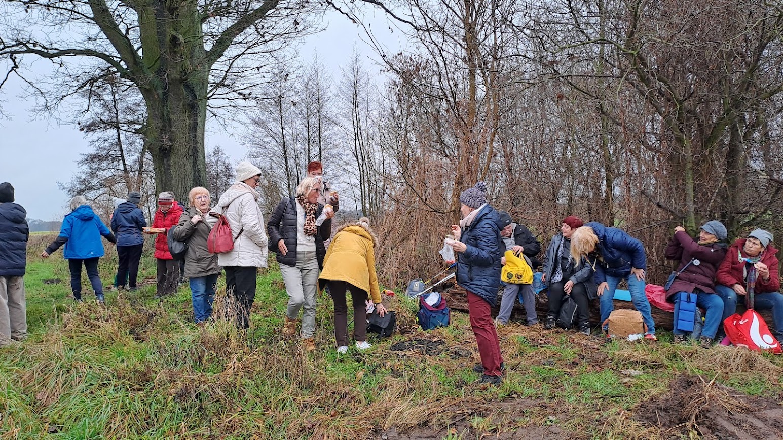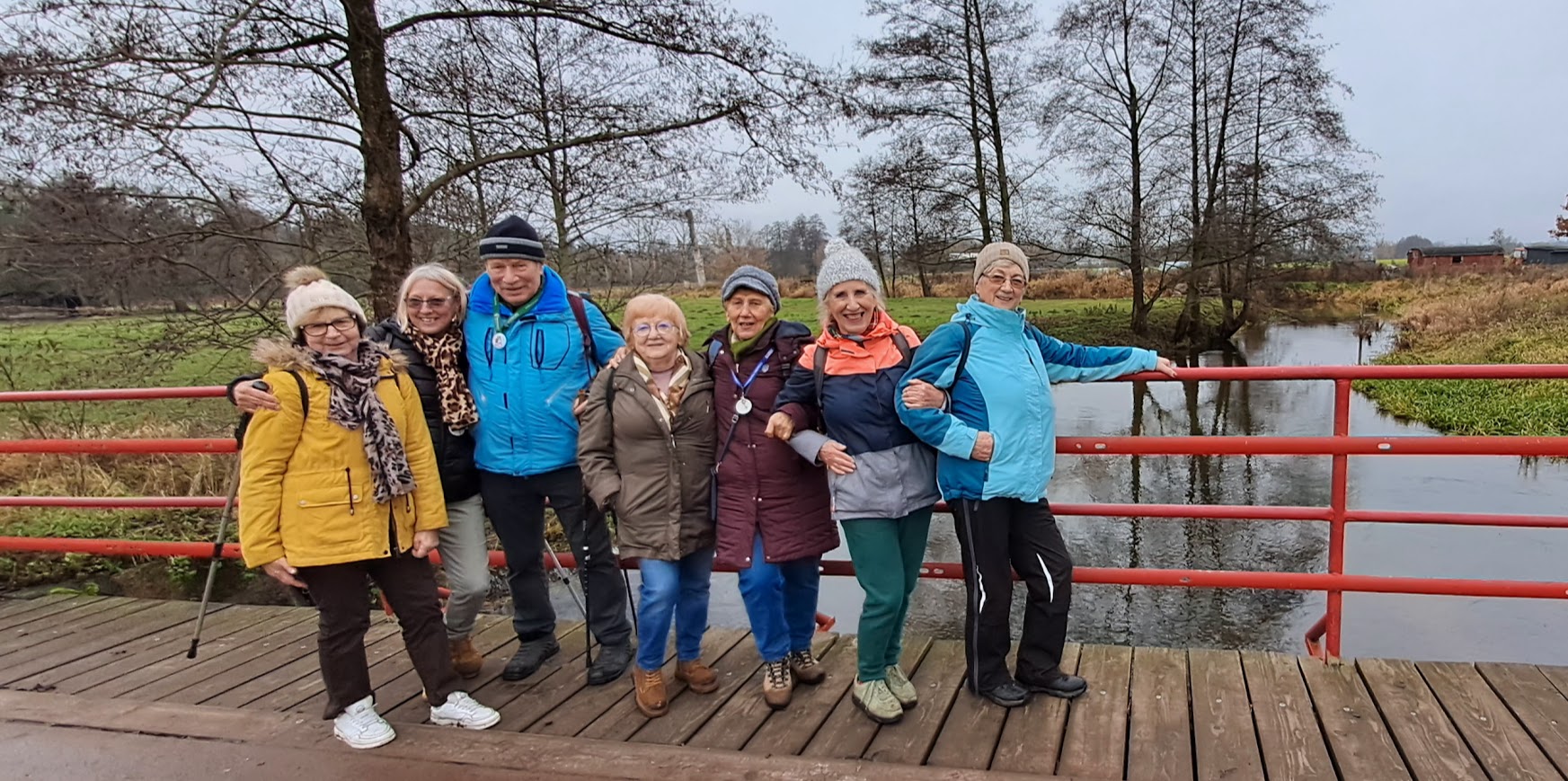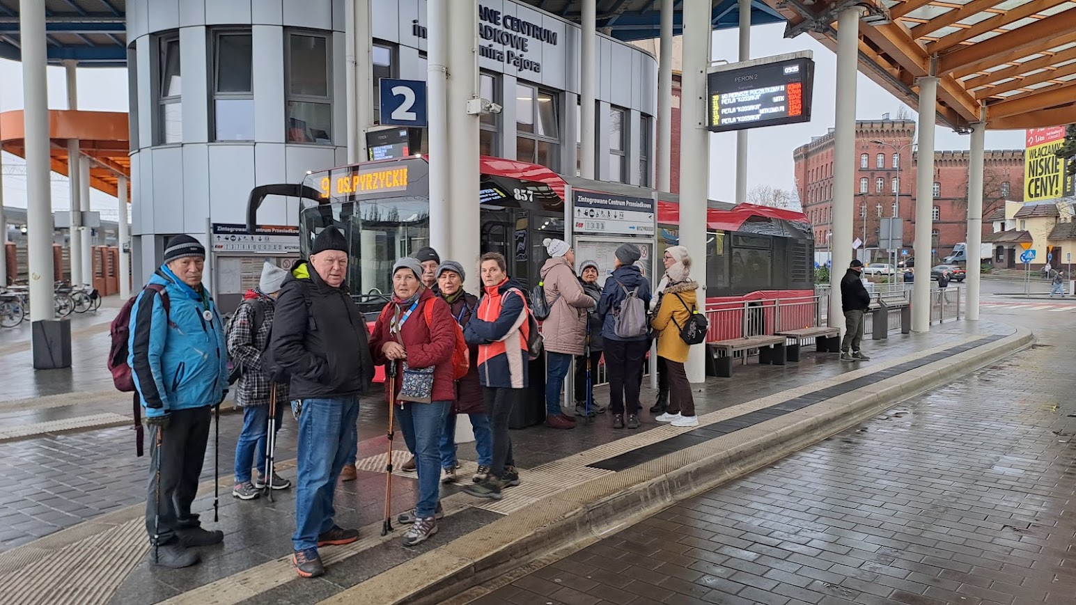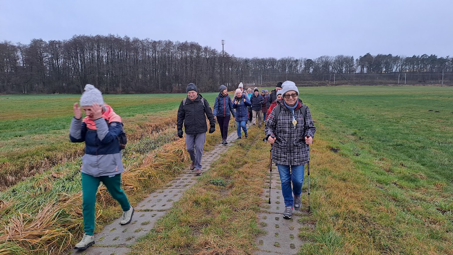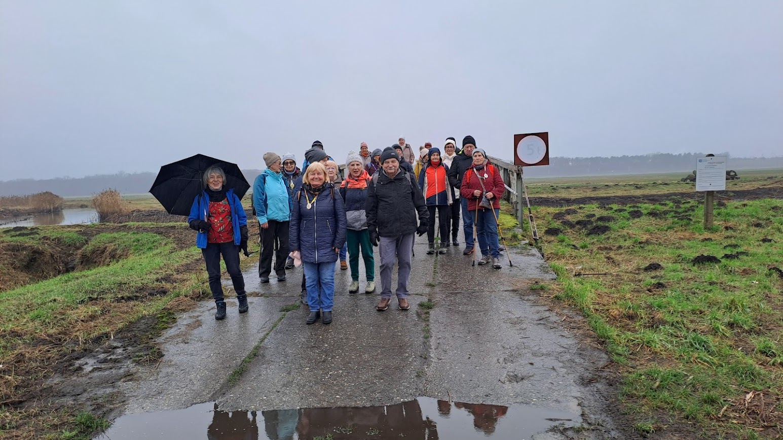 We wtorek 09.12.2025 r, pomimo fatalnych prognoz pogodowych, nasza niezawodna, wędrująca gromada, w liczbie 23 uczestników, wybrała się na wycieczkę po witkowskich łąkach. Ze Stargardu pojechaliśmy autobusem nr 30 do Witkowa i stamtąd wyruszyliśmy pieszo, drogą prowadzącą przez witkowskie łąki. Jesienią jest tam bardzo cicho, brak śpiewających ptaków . Niemniej udało się nam zauważyć jeden klucz lecących gęsi i dwa niewielkie stada łabędzi. Pogoda mglista z temperaturą ponad 10 stopni, co jest pewną anomalią w grudniu, więc ptaki też zmieniają swoje miejsca pobytu. Przeszliśmy przez most na rzece Inie i poszliśmy dalej drogą, która po pewnym czasie skręcała w kierunku Stargardu. Na rozstaju dróg mieliśmy króciutki postój aby posilić się energetyczną herbatką serwowaną przez naszą Irenkę. Początkowo szliśmy prawie suchą drogą wyłożoną płytami jumbo, aż do przejścia przez tunel dla zwierząt pod S10. Po obu stronach rozciągały się rozległe witkowskie łąki, nawet jeszcze zielone, o tej porze roku. Za tunelem , weszliśmy w teren trochę zadrzewiony, gdzie zaczęło się dosyć mocne błotko na naszej drodze. Szliśmy gęsiego uważając, aby nie wpaść w jakąś błotnistą kałużę, lub się nie poślizgnąć. Ale daliśmy radę i jakoś wszyscy sprawnie doszliśmy do miejsca bardziej suchego, gdzie zatrzymaliśmy się na dłuższy odpoczynek. Tym razem ogniska nie rozpalaliśmy, bo wszystko było bardzo mokre po nocnych opadach deszczu. Dalej, to już była dosyć wygodna droga prowadząca obok przepływającej rzeki Krąpiel, aż do czerwonego mostku. Później przeszliśmy koło pomnikowego dębu i dalej przez przejazd kolejowy i doszliśmy do ulicy Nowowiejskiej.