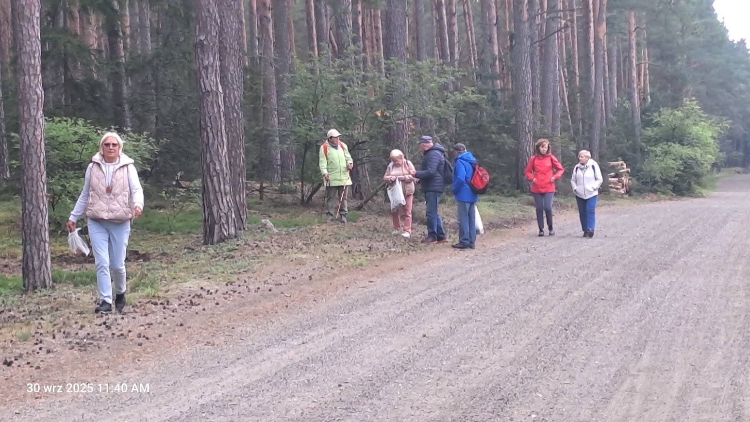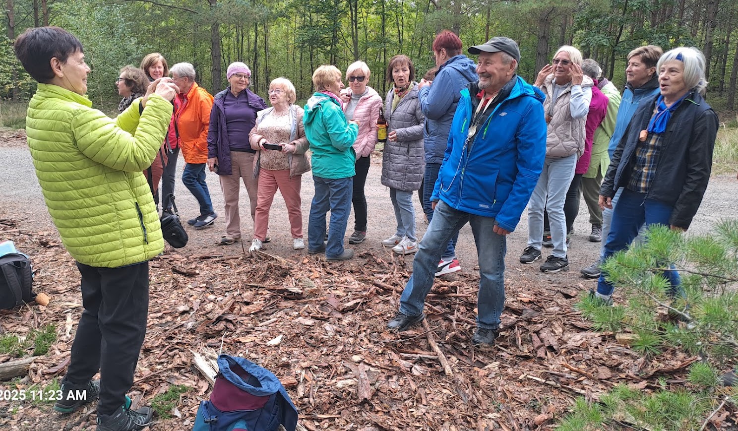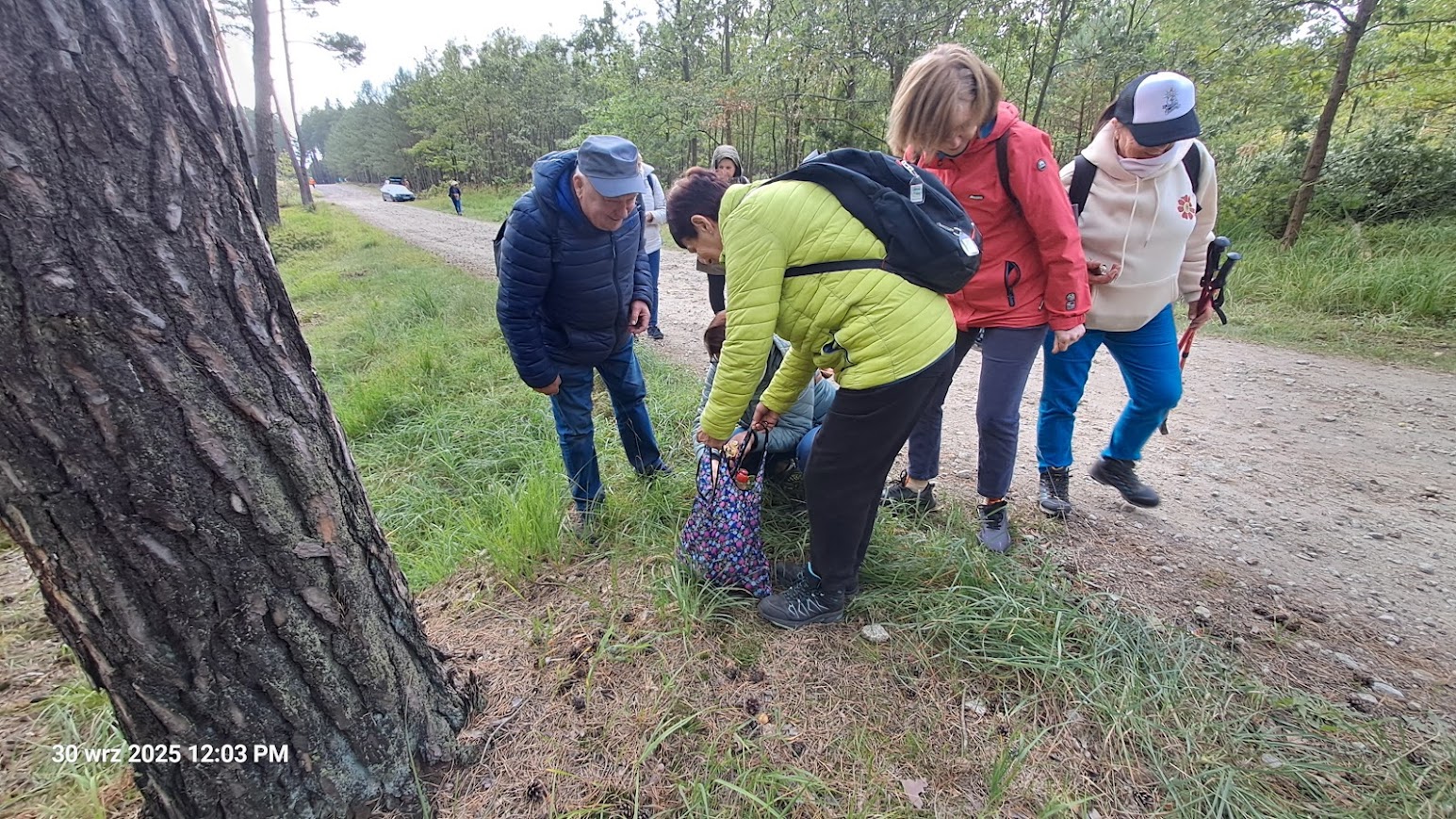 Ostatni wtorek tj 30.09.2025 r., to nasz kolejny wycieczkowy dzień. W planie mieliśmy wycieczkę z Reptowa do Sowna. Tylko tym razem nie planowaliśmy ogniska w Sownie, tylko sam pobyt w lasach. Sezon grzybowy na razie nieco przyhamował z powodu braku deszczu i zimnych nocy, ale co tam, można sprawdzić co też w tych naszych lasach się znajduje. 24 osoby wysiadły w Reptowie z pociągu i poszliśmy drogą przez lasy. Dosyć szybko nasza gromadka rozpierzchła się po lesie. Szliśmy dosyć wolno, aby ci co grzybków szukają, nie zostawali za bardzo w tyle. Mimo to, nasza gromadka bardzo się rozciągnęła. Dla tego też nasz pierwszy postój w lesie, ustanowiony został już w odległości 1/3 naszej trasy. Sporo osób mogło się pochwalić swoimi zbiorami grzybków. Po pewnym czasie wszyscy się zeszliśmy i zaczął się mały poczęstunek. Tym razem głównym daniem był chleb ze smalcem i ogóreczkami. Po ostatniej naszej imprezie zostało sporo smalcu, więc został przyniesiony na tę wycieczkę. Każdy zjadł sobie tyle kromek ile chciał. Smaluszek własnej roboty na wycieczkach wszystkim smakuje. Były też ciasteczka, cukierki i pachnące pysznością kiełbaski. Atmosfera naszej leśnej biesiady jak zwykle była wspaniała. Niektórzy nawet chcieli by zostać w tym miejscu na dłużej i już nawet myśleli, że chyba do Sowna nie pójdziemy, tylko w tym miejscu pochodzimy dalej za grzybami i wrócimy z powrotem do Reptowa. Jednak ta koncepcja pod „naporem” większości upadła. Powstawaliśmy więc i ruszyliśmy dalej drogą przez lasy, aby dojść do Sowna. Jak się później okazało, był to bardzo dobry wybór, bo po drodze znajdowaliśmy coraz więcej grzybów. Były to podgrzybki, kozaki, kanie, maślaki, kilka prawdziwków i troszkę rydzów. Największą niespodzianką były rydze, których na trasie naszej wycieczki nigdy wcześniej nie znajdowaliśmy. Wszyscy byli bardzo zadowoleni ze znalezionych grzybków. Jak się później w Sownie okazało, to dzisiejsze zbiory były całkiem spore. Do autobusu zdążyliśmy przyjść przed czasem. Nikt w lesie nie został. Dzisiaj to była naprawdę bardzo przyjemna i bardzo fajna wycieczka przez lasy. Za dwa tygodnie pójdziemy znowu przez lasy, ale zupełnie inną trasą.