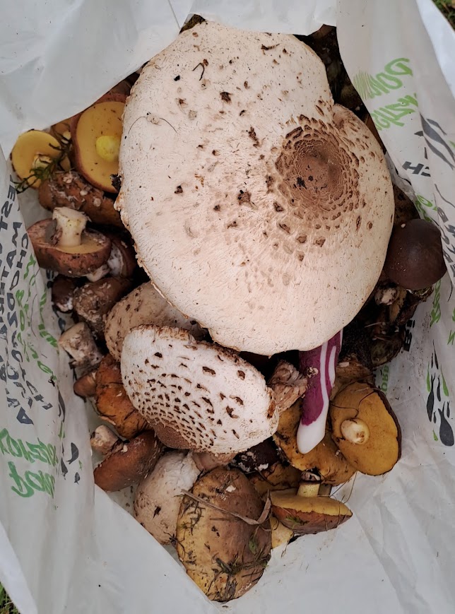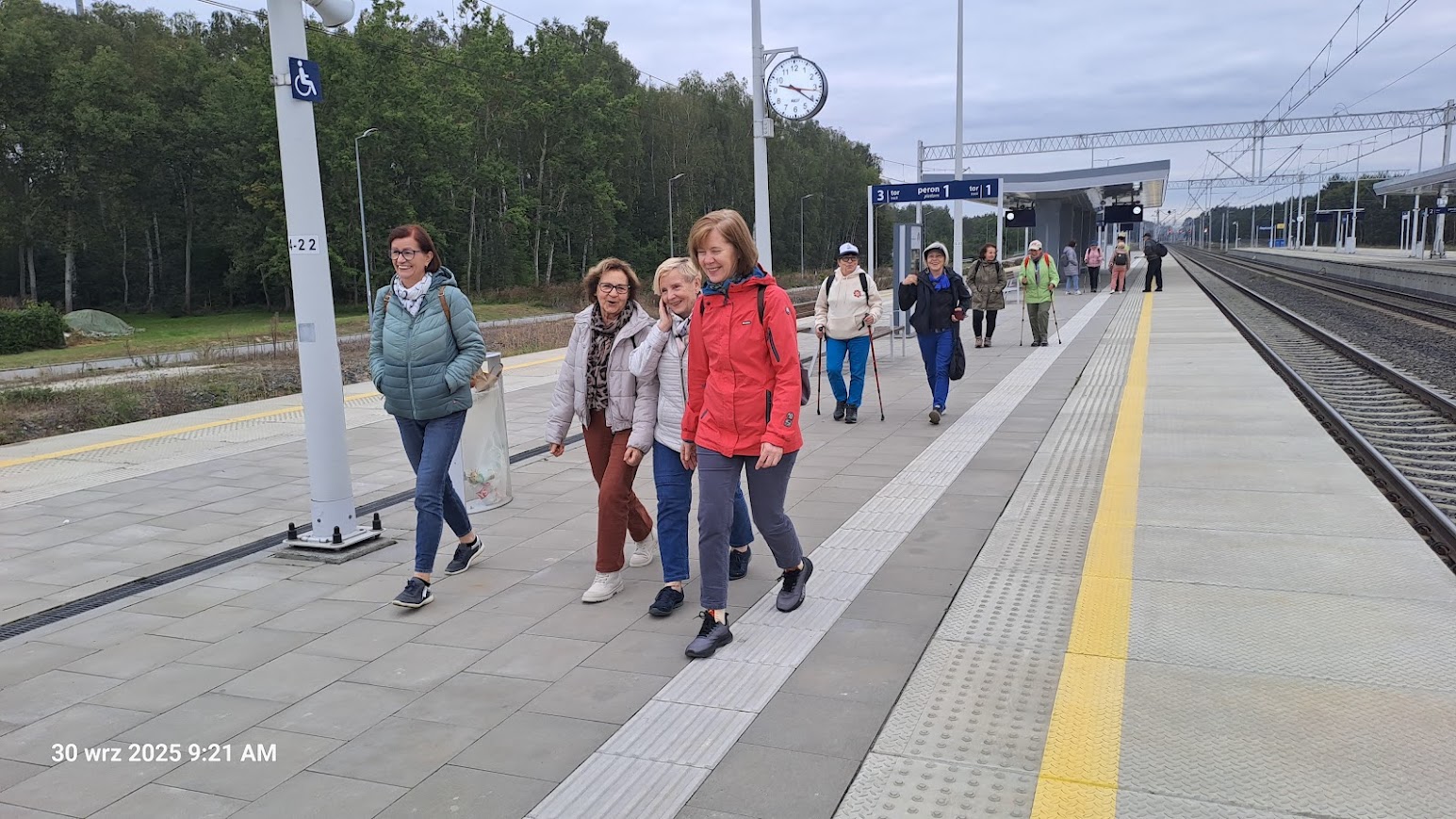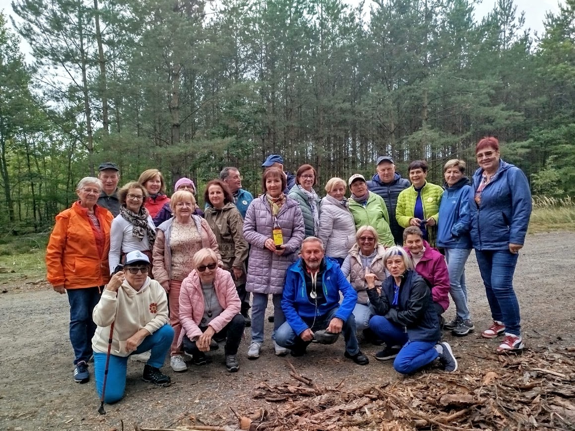 Ostatni wtorek tj 30.09.2025 r., to nasz kolejny wycieczkowy dzień. W planie mieliśmy wycieczkę z Reptowa do Sowna. Tylko tym razem nie planowaliśmy ogniska w Sownie, tylko sam pobyt w lasach. Sezon grzybowy na razie nieco przyhamował z powodu braku deszczu i zimnych nocy, ale co tam, można sprawdzić co też w tych naszych lasach się znajduje. 24 osoby wysiadły w Reptowie z pociągu i poszliśmy drogą przez lasy. Dosyć szybko nasza gromadka rozpierzchła się po lesie. Szliśmy dosyć wolno, aby ci co grzybków szukają, nie zostawali za bardzo w tyle. Mimo to, nasza gromadka bardzo się rozciągnęła. Dla tego też nasz pierwszy postój w lesie, ustanowiony został już w odległości 1/3 naszej trasy. Sporo osób mogło się pochwalić swoimi zbiorami grzybków. Po pewnym czasie wszyscy się zeszliśmy i zaczął się mały poczęstunek. Tym razem głównym daniem był chleb ze smalcem i ogóreczkami. Po ostatniej naszej imprezie zostało sporo smalcu, więc został przyniesiony na tę wycieczkę. Każdy zjadł sobie tyle kromek ile chciał. Smaluszek własnej roboty na wycieczkach wszystkim smakuje. Były też ciasteczka, cukierki i pachnące pysznością kiełbaski. Atmosfera naszej leśnej biesiady jak zwykle była wspaniała. Niektórzy nawet chcieli by zostać w tym miejscu na dłużej i już nawet myśleli, że chyba do Sowna nie pójdziemy, tylko w tym miejscu pochodzimy dalej za grzybami i wrócimy z powrotem do Reptowa. Jednak ta koncepcja pod „naporem” większości upadła. Powstawaliśmy więc i ruszyliśmy dalej drogą przez lasy, aby dojść do Sowna. Jak się później okazało, był to bardzo dobry wybór, bo po drodze znajdowaliśmy coraz więcej grzybów. Były to podgrzybki, kozaki, kanie, maślaki, kilka prawdziwków i troszkę rydzów. Największą niespodzianką były rydze, których na trasie naszej wycieczki nigdy wcześniej nie znajdowaliśmy. Wszyscy byli bardzo zadowoleni ze znalezionych grzybków. Jak się później w Sownie okazało, to dzisiejsze zbiory były całkiem spore. Do autobusu zdążyliśmy przyjść przed czasem. Nikt w lesie nie został. Dzisiaj to była naprawdę bardzo przyjemna i bardzo fajna wycieczka przez lasy. Za dwa tygodnie pójdziemy znowu przez lasy, ale zupełnie inną trasą.